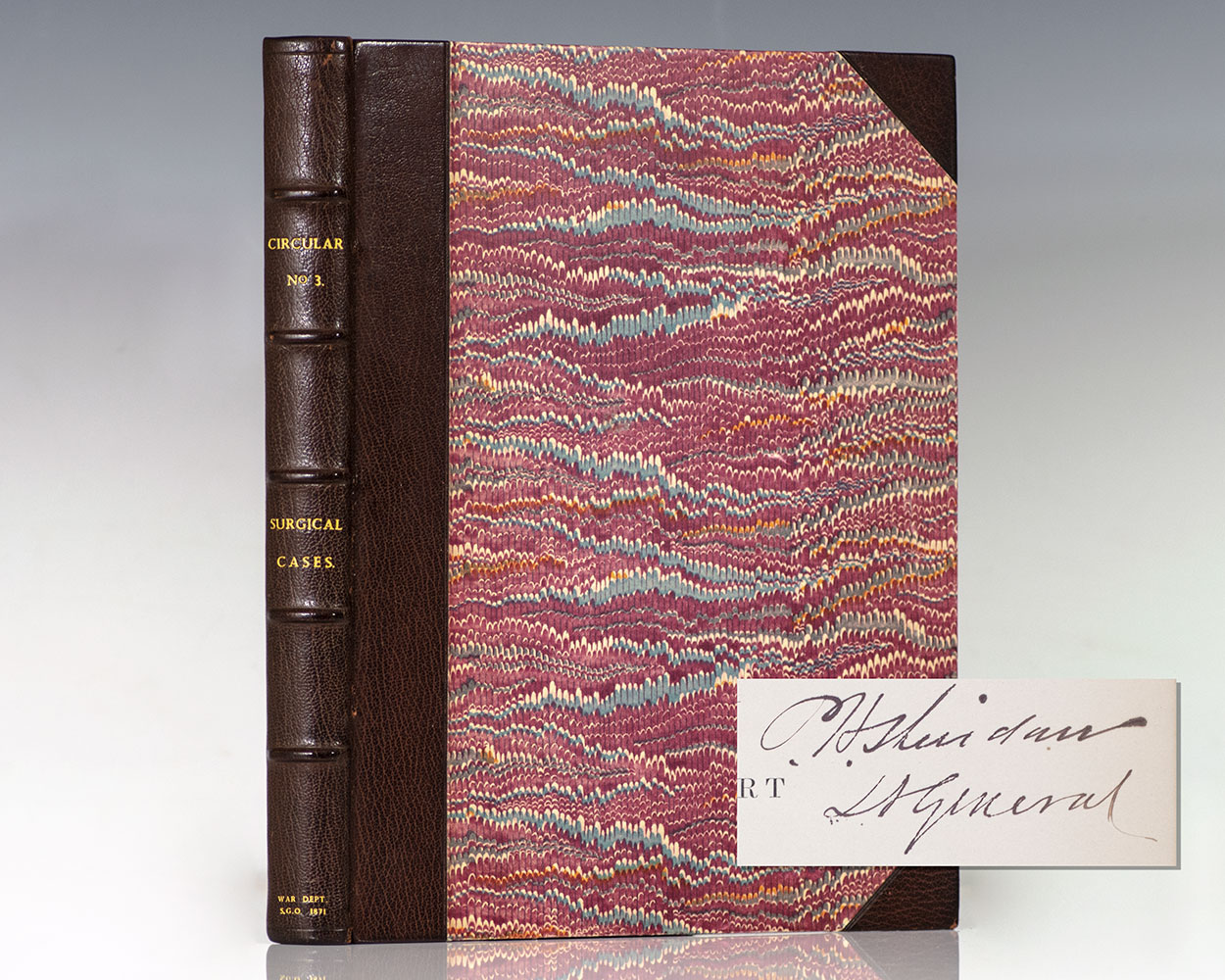 First edition of this scarce volume issued by the Surgeon General's Office, covering various surgical and medical innovations in the United States Army in the years immediately following the Civil War. Quarto, bound in three quarter morocco over marbled boards by Brian Frost & Company with gilt titles to the spine, marbled endpapers, all edges marbled, illustrated with four lithographic plates and numerous in-text anatomical illustrations. From the library of Union Army General Philip Sheridan with his ownership signature to the title page. In near fine condition. Bookplate to the pastedown.