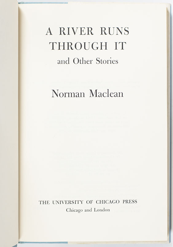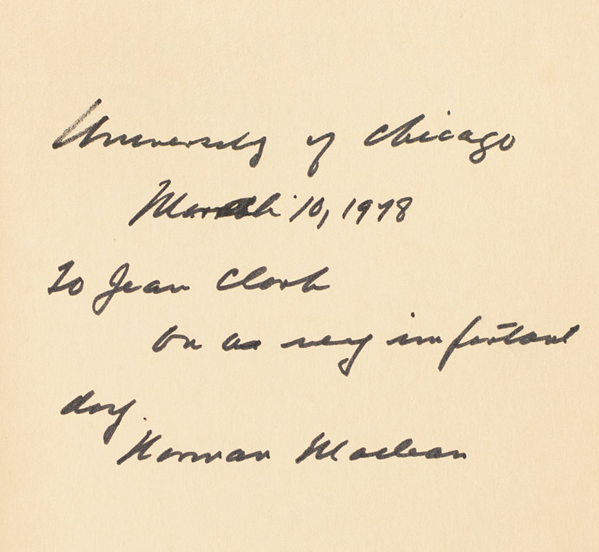 Early printing one of only 1,577 copies of Maclean's first book. Octavo, original cloth. Presentation copy, warmly inscribed and dated by the author on the front free endpaper, "University of Chicago March 10, 1979 To Jean Clark on a very important day Norman Maclean." Near fine in a near fine dust jacket.