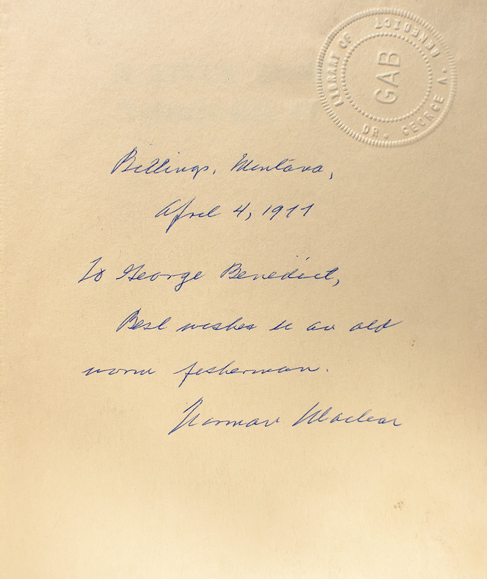 First edition of Maclean's classic first book. Octavo, original cloth. Warmly inscribed by Norman Maclean on the front free endpaper. Very good in a very good price-clipped dust jacket, owner name embossed to the front free endpaper. Jacket photograph by Joel Snyder. Uncommon signed and inscribed.