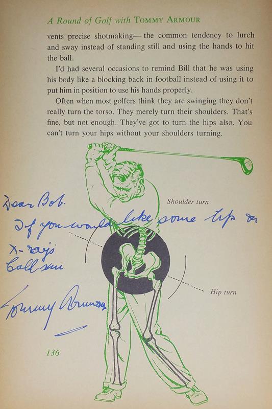 First edition. Octavo, original cloth. Inscribed by the author, "For Dr. Bob Russo with regards from Tommy Armour P.S. For information turn to page 136". On page 136 Armour has written, "Dear Bob/ If you would like some tips on x-rays call him/ Tommy Armour." Usual tanning to the page edges in a near fine jacket with light wear.