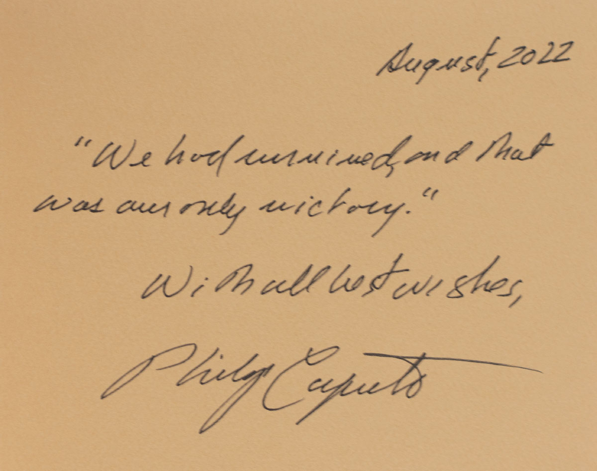 First edition of this classic work which the Los Angeles Times Book Review called "heartbreaking, terrifying, and enraging. It belongs to the literature of men at war." Octavo, original cloth. Inscribed by the author on the front free endpaper, "August, 2022 'We had survived, and that was our only victory.' With all best wishes, Philip Caputo." Near fine in a near fine dust jacket. Jacket illustration by Manny Haller.