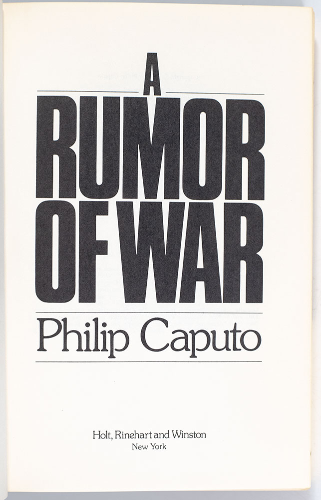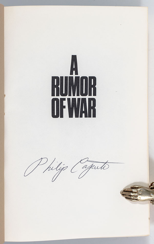 First edition, early printing of this classic work, which the Los Angeles Times Book Review called "heartbreaking, terrifying, and enraging. It belongs to the literature of men at war." Octavo, original cloth. Signed by Philip Caputo on the half-title page. Very good in a very good dust jacket. Jacket illustration by Manny Haller.