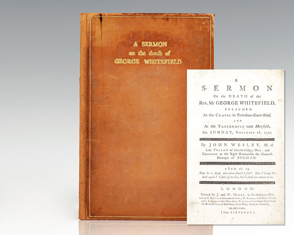 First edition of Wesley's sermon preached at the funeral of fellow founder of Methodism, Reverend George Whitefield. Octavo, bound in contemporary calf with gilt ruling and title to the front panel. One of the three founders of the Methodist movement along with John and Charles Wesley, Whitefield gained widespread recognition during his 1740 journey to North American where he preached a series of revivals that became part of the "Great Awakening." He preached nearly 20,000 sermons throughout his ministry, enthralling large audiences with a potent combination of drama and rhetoric. In very good condition.