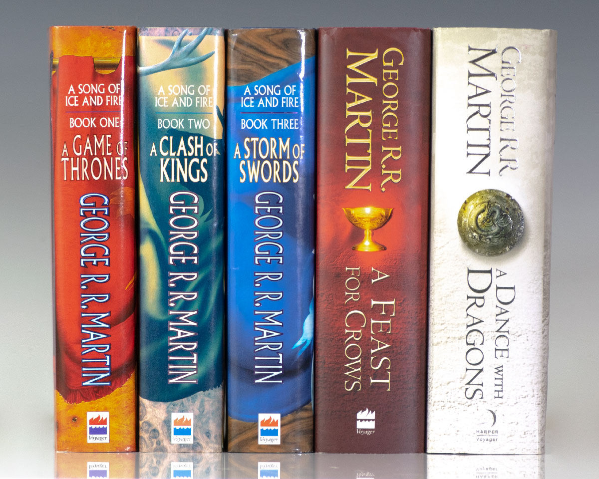 First British editions of each volume in George R.R. Martin's acclaimed Game of Thrones series. Octavo, 5 volumes, original cloth. Each volume is fine in a fine dust jacket. Jacket artwork by Jim Burns and Larry Rostant.