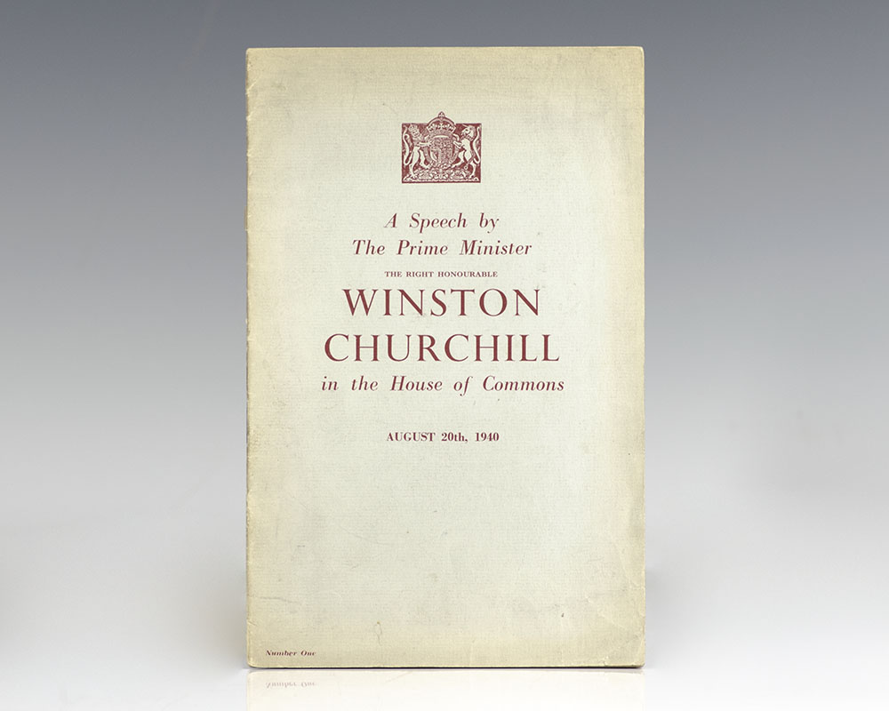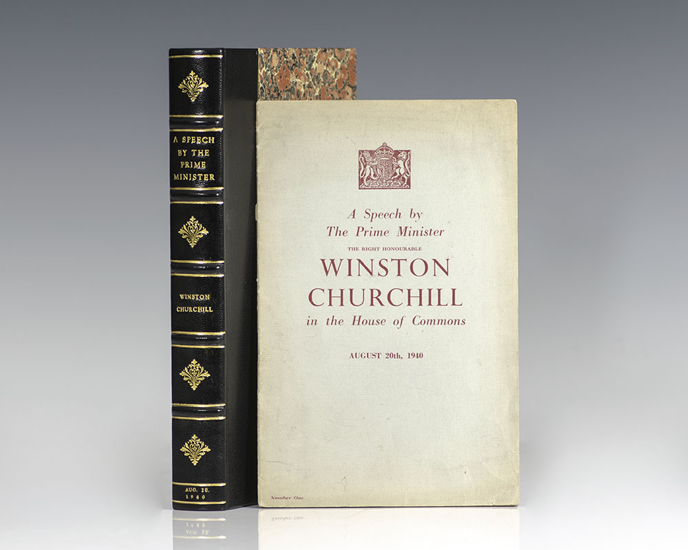First edition of one of Winston Churchill's most famous speeches. Octavo, original gray wrappers. In near fine condition. Housed in a custom half morocco clamshell box. An exceptional presentation.