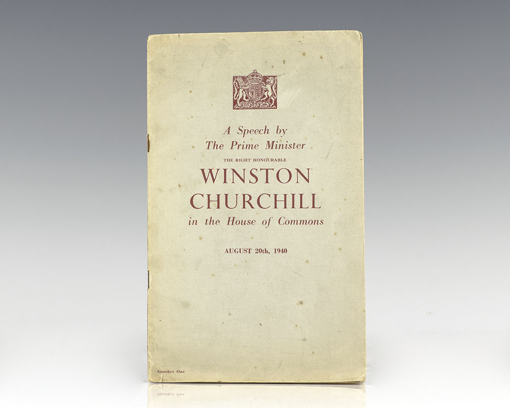 First edition of one of Winston Churchill's most famous speeches. Octavo, original gray wrappers. In very good condition.