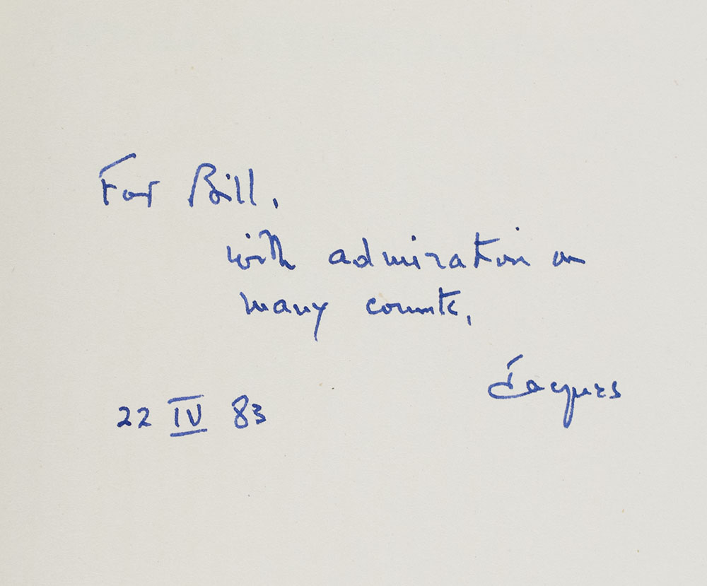 First edition of Barzun's intimate biography of "Father of American psychology", William James. Octavo, original cloth. Association copy, inscribed by the author in the year of publication on the front free endpaper, "For Bill, with admiration on many counts. Jacques 22 IV 83." The recipient, William Safire was an important American author, columnist, journalist, and presidential speechwriter. He joined Nixon’s campaign for the 1960 Presidential race, and supported him again in 1968. After Nixon’s 1968 victory, Safire served as a speechwriter for him and Spiro Agnew. He authored several political columns in addition to his weekly column “On Language” in The New York Times Magazine from 1979 until the month of his death and authored two books on grammar and linguistics: The New Language of Politics (1968) and what Zimmer called Safire’s “magnum opus,” Safire’s Political Dictionary. Safire later served as a member of the Pulitzer Prize Board from 1995 to 2004 and in 2006 was awarded the Presidential Medal of Freedom by President George W. Bush. With two typed transmittal letters signed by Barzun to Safire laid in. Near fine in a very good dust jacket.