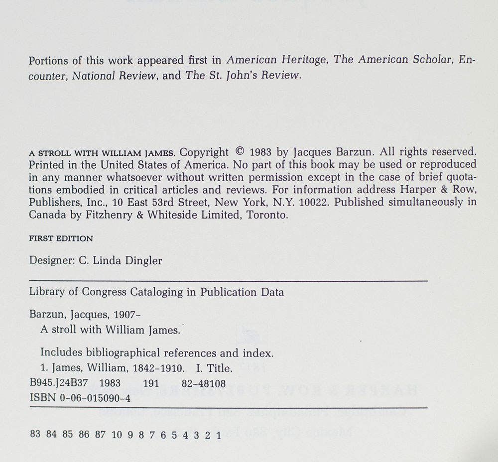 First edition of Jacques Barzun's A Stroll With William James; inscribed by him to American journalist William Safire