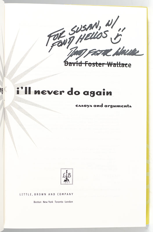 First edition of this collection of essays. Octavo, original half cloth. Presentation copy, inscribed by the author on the title page, "For Susan W/Fond Hellos David Foster Wallace." Fine in a fine dust jacket. Jacket design by Elizabeth Van Itallie.