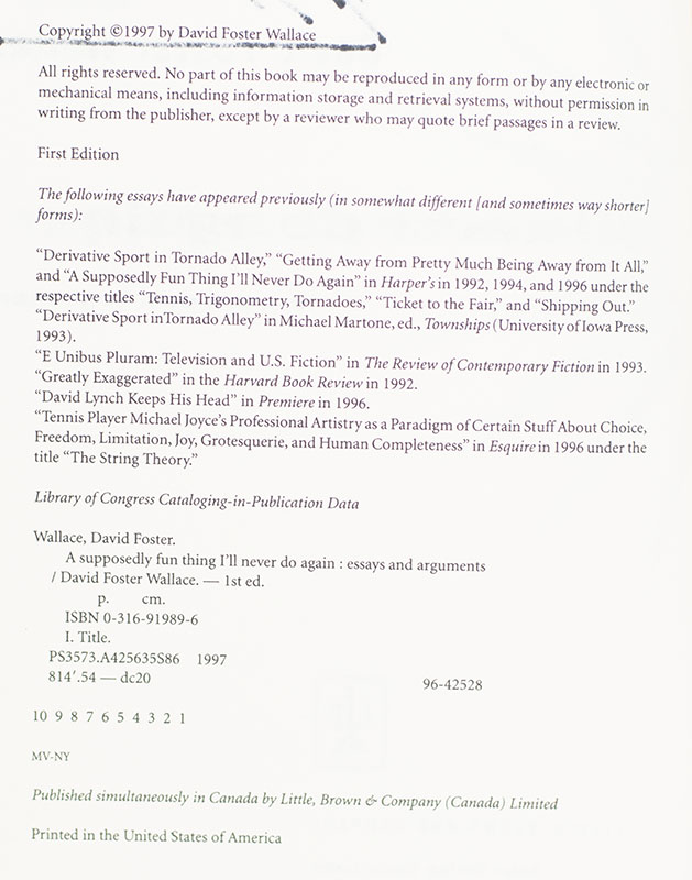 "Lonely people tend, rather, to be lonely because they decline to bear the psychic costs of being around other humans. They are allergic to people. People affect them too strongly": First Edition of A Supposedly Fun Thing I’ll Never Do Again; Signed by David Foster Wallace