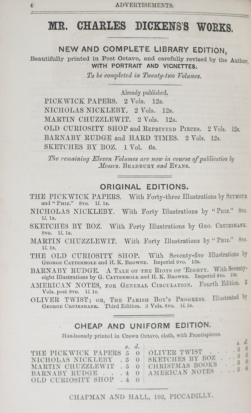 First edition, first issue of one of Dickens’ most enduring works, with p.213 in part 7/8 mispaginated "113", and signature mark 'b' present on List of Plates at end, etched frontispiece, additional title and 14 plates by "Phiz" (Hablot K. Browne). Octavo, original blue-green wrappers. Complete with all the advertisements called for by Hatton & Cleaver, and the two rare slips in parts 1 and 5. Includes three variant issues of part 1, one with Morison's 'premises' advert, the second with Morison's 'lion' advert, and the third with the rare French version of the Morison's 'lion' advert. In near fine condition. A scarce and desirable complete set in original parts. Housed in a custom folding clamshell box.