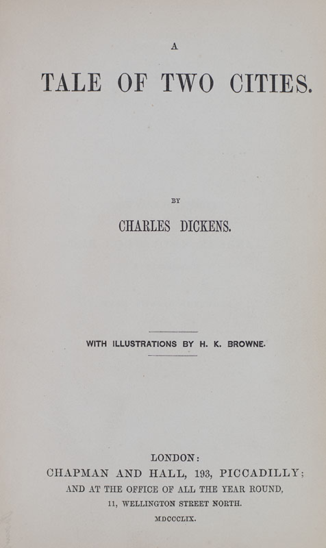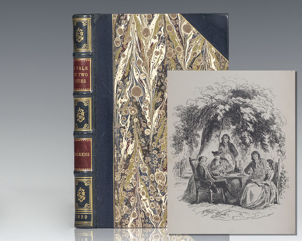 The most famous and possibly the most popular of Dickens's novels, A Tale of Two Cities shows a master of dramatic narrative extracting gold from the ore of history. If the bloody tableau of the French Revolution were not in itself sufficient for a dozen novels, Dickens added to it a professional resurrectionist, an authentic ogress, and an antihero as convincingly flawed as any in modern literature. “Dickens had always admired Carlyle’s History of the French Revolution, and asked him to recommend suitable books from which he could research the period; in reply Carlyle sent him a ‘cartload’ of volumes… So great was [Dickens’] enthusiasm for the story that it had indeed ‘taken in possession’ of him… The force of the novel springs from its exploration of darkness and death but its beauty derives from Dickens’ real sense of transcendence, from his ability to see the sweep of destiny” (Ackroyd, 858). The last of Dickens’ books to be illustrated by H.K. Browne (“Phiz”), with 16 engraved plates by him. “Browne, for 23 years responsible for all the etchings which had so successfully embellished these [Dickens’] books, produced his last drawings for the present work… Bradbury and Evans, the printers of all and publishers of five of Dickens’ works as issued in monthly parts, had ceased to act in this dual capacity after completion of Little Dorrit… [resulting] in the return of Chapman and Hall as publishers of this and all succeeding works” (Hatton & Cleaver, 333).
