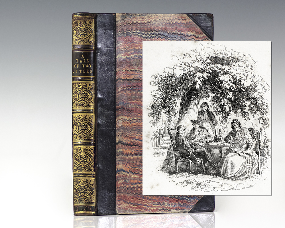 The most famous and possibly the most popular of Dickens's novels, A Tale of Two Cities shows a master of dramatic narrative extracting gold from the ore of history. If the bloody tableau of the French Revolution were not in itself sufficient for a dozen novels, Dickens added to it a professional resurrectionist, an authentic ogress, and an antihero as convincingly flawed as any in modern literature. “Dickens had always admired Carlyle’s History of the French Revolution, and asked him to recommend suitable books from which he could research the period; in reply Carlyle sent him a ‘cartload’ of volumes… So great was [Dickens’] enthusiasm for the story that it had indeed ‘taken in possession’ of him… The force of the novel springs from its exploration of darkness and death but its beauty derives from Dickens’ real sense of transcendence, from his ability to see the sweep of destiny” (Ackroyd, 858). The last of Dickens’ books to be illustrated by H.K. Browne (“Phiz”), with 16 engraved plates by him. “Browne, for 23 years responsible for all the etchings which had so successfully embellished these [Dickens’] books, produced his last drawings for the present work… Bradbury and Evans, the printers of all and publishers of five of Dickens’ works as issued in monthly parts, had ceased to act in this dual capacity after completion of Little Dorrit… [resulting] in the return of Chapman and Hall as publishers of this and all succeeding works” (Hatton & Cleaver, 333).