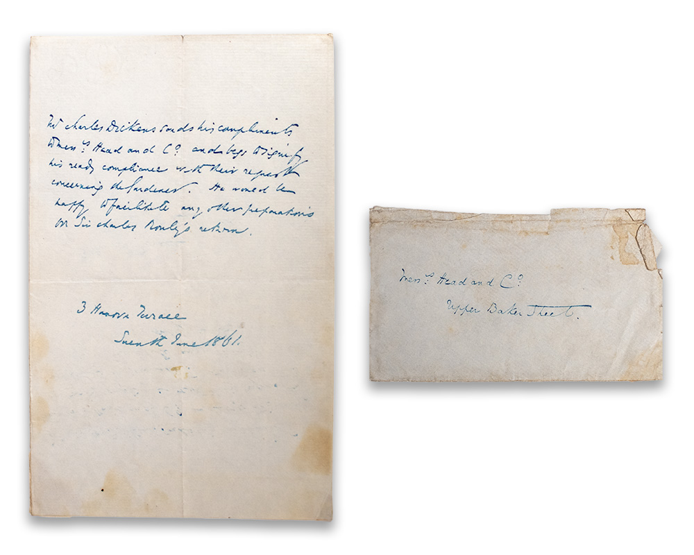 First edition, mixed issue of one of Dickens' most enduring works. Octavo, bound in three quarters modern half calf over marbled boards with gilt titles and tooling to the spine in five compartments within raised gilt bands, all edges marbled, marbled endpapers, illustrated with sixteen plates after H.K. Browne including the frontispiece and title vignette. A mixed issue copy with first state "b" signature to the list of plates at the rear and "affectionately" misspelled on page 134 line 12, and second state correctly numbered page 213. In near fine condition with light toning. Accompanied by an autograph note written by Charles Dickens in the third person in blue ink and addressed to Messrs. Head & Co. The letter reads in full, "Mr Charles Dickens sends his compliments to Messrs. Head and Co. and begs to signify his ready compliance with their request concerning the gardener. He would be happy to facilitate any other preparations on Sir Charles Rowley's return. 3 Hanover Terrace Seventh June 1861." Together with the original envelope with Dicken's personal monogram to the verso and addressed by him on the recto, "Messrs. Head and Co. Upper Baker Street." In very good condition with mailing creases and remnants of mounting to verso corners, with the envelope in good condition. The piece measures 5 inches by 8 inches.