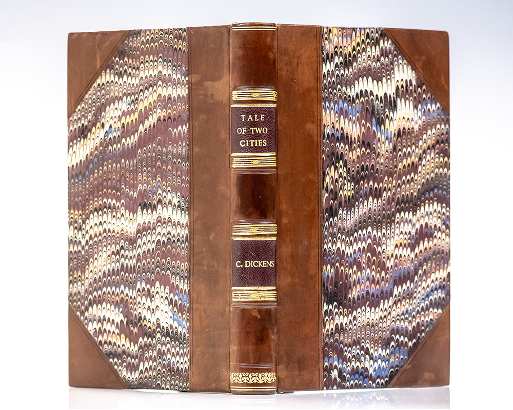 The most famous and possibly the most popular of Dickens's novels, A Tale of Two Cities shows a master of dramatic narrative extracting gold from the ore of history. If the bloody tableau of the French Revolution were not in itself sufficient for a dozen novels, Dickens added to it a professional resurrectionist, an authentic ogress, and an antihero as convincingly flawed as any in modern literature. “Dickens had always admired Carlyle’s History of the French Revolution, and asked him to recommend suitable books from which he could research the period; in reply Carlyle sent him a ‘cartload’ of volumes… So great was [Dickens’] enthusiasm for the story that it had indeed ‘taken in possession’ of him… The force of the novel springs from its exploration of darkness and death but its beauty derives from Dickens’ real sense of transcendence, from his ability to see the sweep of destiny” (Ackroyd, 858). The last of Dickens’ books to be illustrated by H.K. Browne (“Phiz”), with 16 engraved plates by him. “Browne, for 23 years responsible for all the etchings which had so successfully embellished these [Dickens’] books, produced his last drawings for the present work… Bradbury and Evans, the printers of all and publishers of five of Dickens’ works as issued in monthly parts, had ceased to act in this dual capacity after completion of Little Dorrit… [resulting] in the return of Chapman and Hall as publishers of this and all succeeding works” (Hatton & Cleaver, 333).