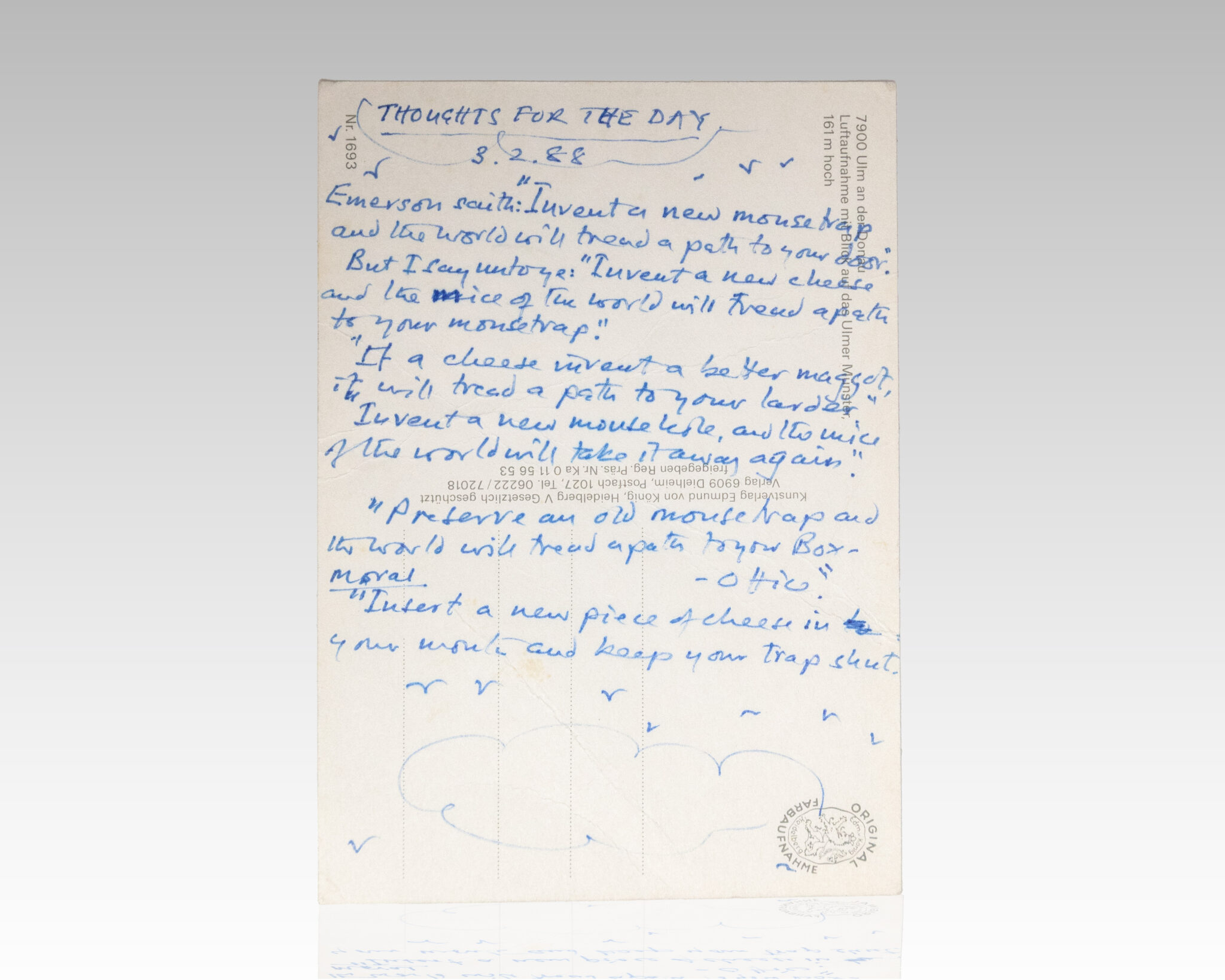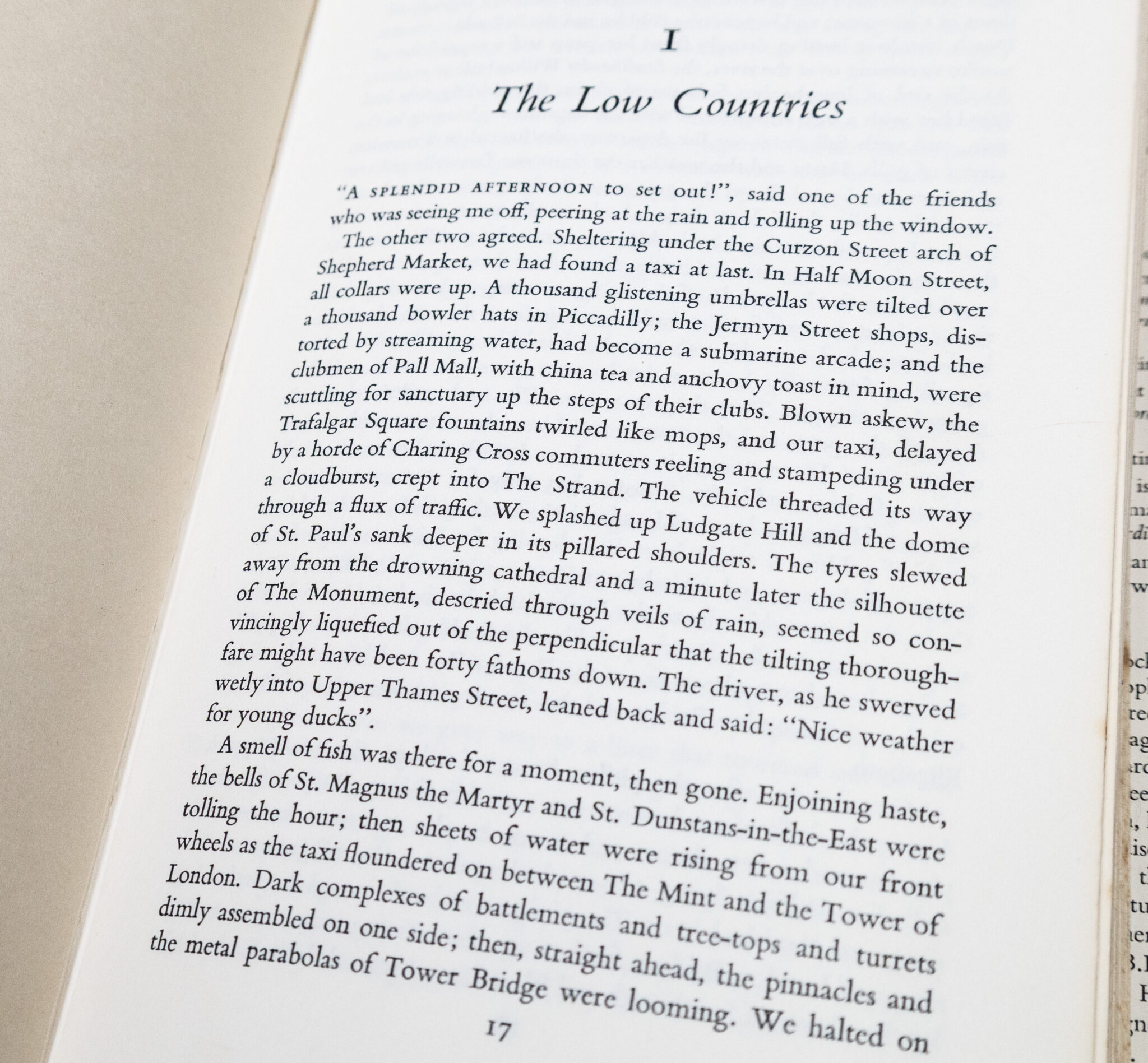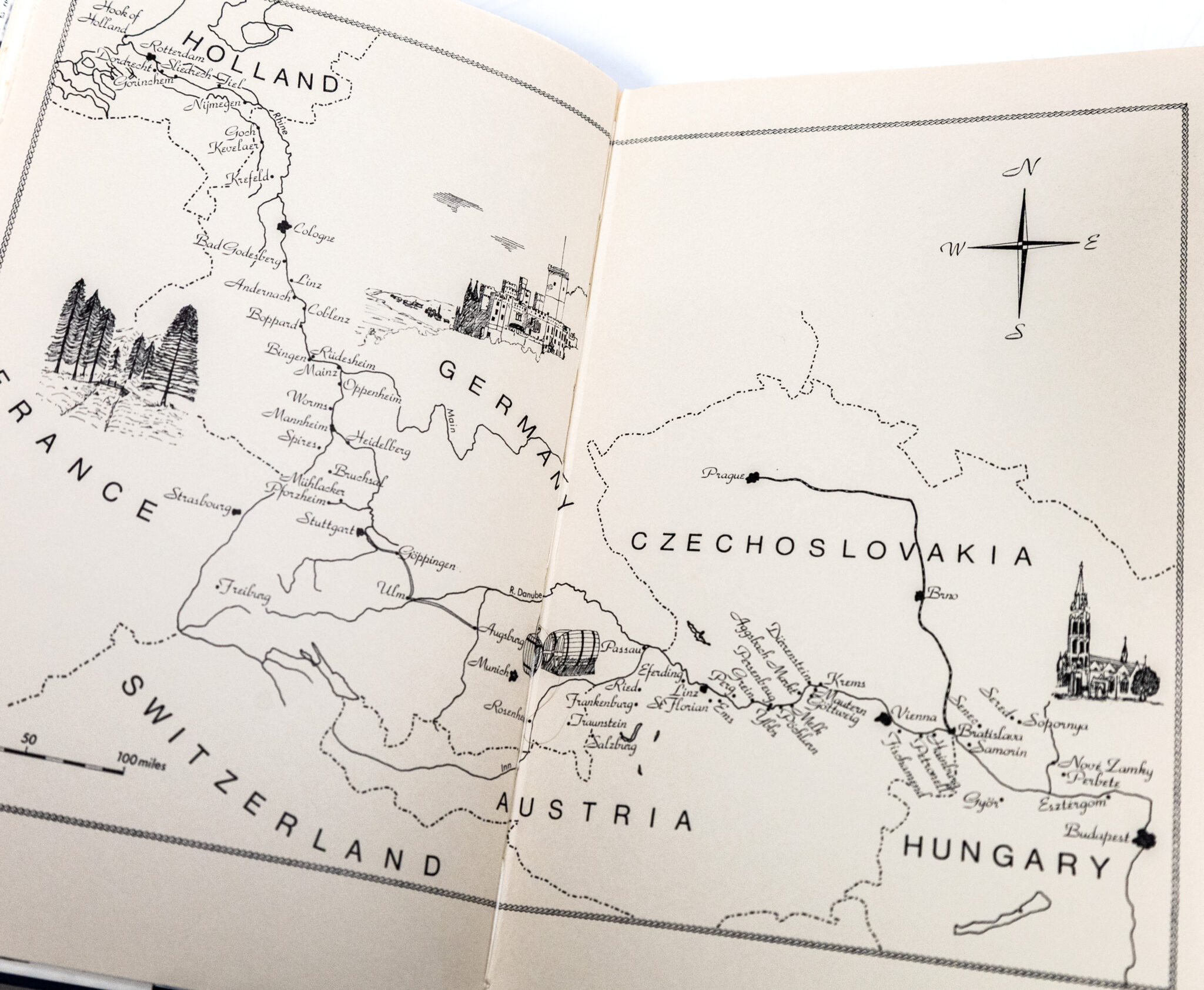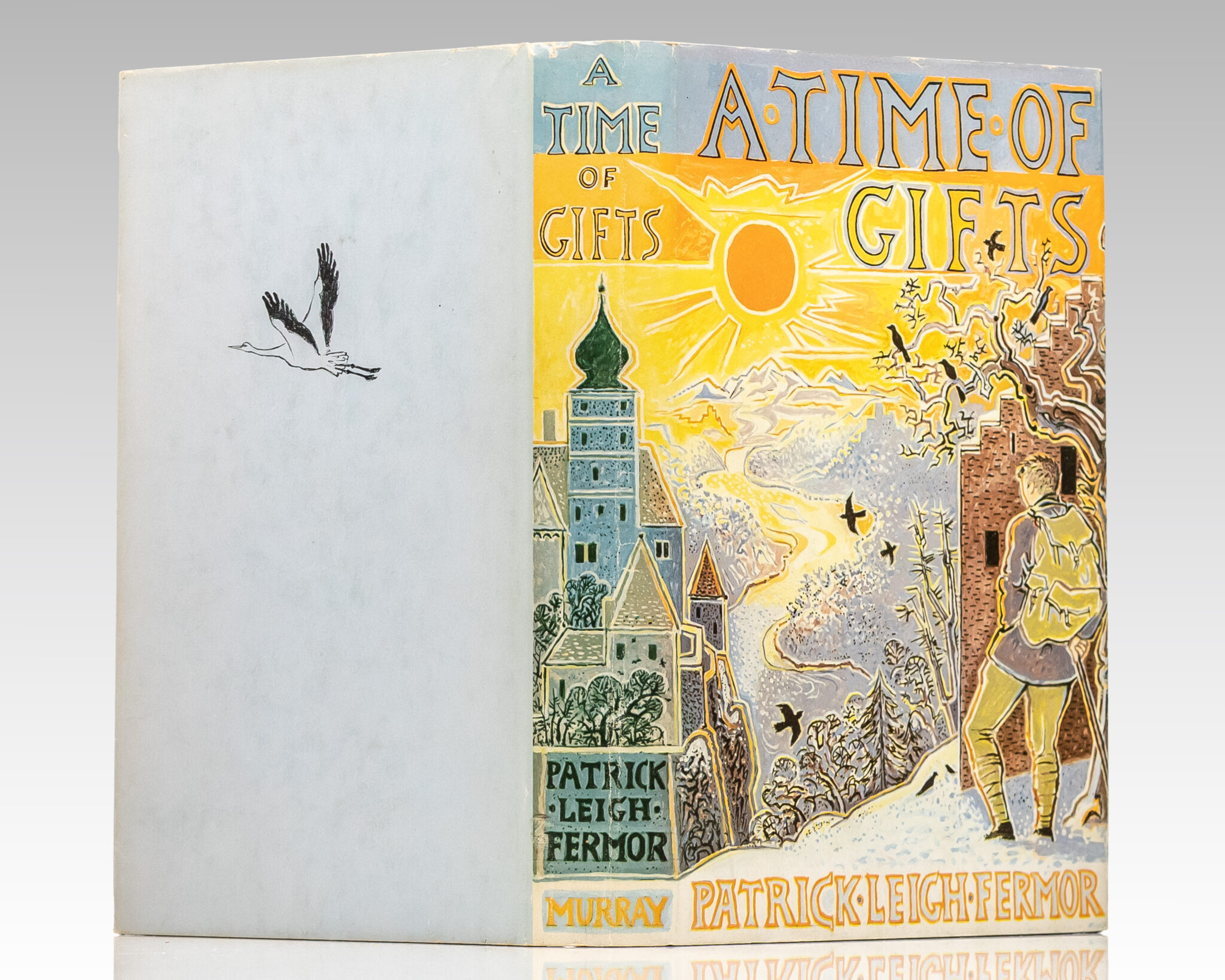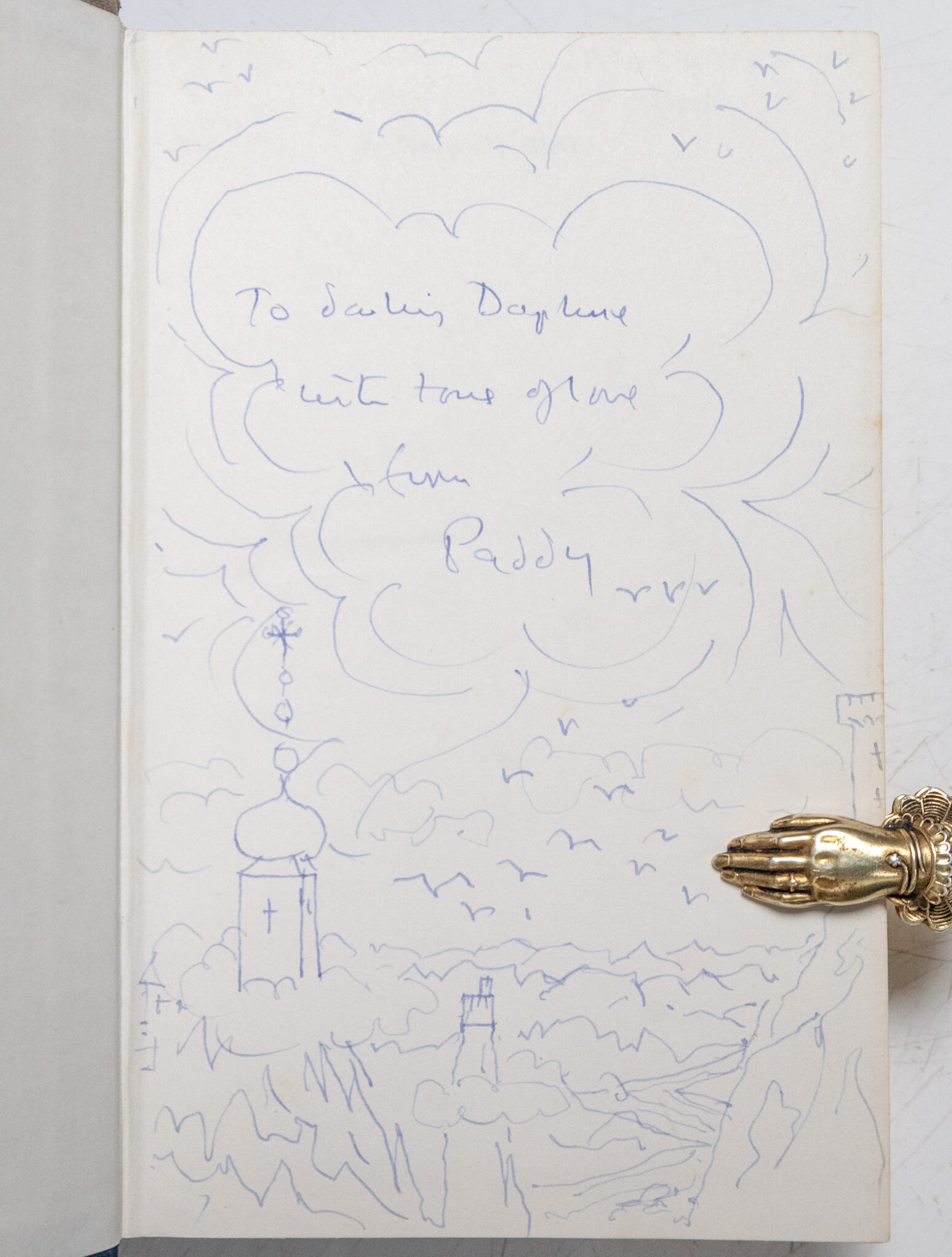 First editions of each volume in Leigh Fermor's trilogy. Octavo, original cloth, pictorial endpapers, illustrated with maps. A Time of Gifts is an association copy, warmly inscribed by Patrick Leigh Fermor on the front free endpaper to Daphne Fielding with with a large ink sketch of a coastal scene with church bell tower, castle tower, cliff faces, sea and birds covering the entire page, "To darling Daphne, with tons of love, from Paddy." The recipient, Daphne Fielding (1904–1997) was a British socialite and writer whose memoirs and biographical works offered a vivid portrait of aristocratic life in the early twentieth century. Born Daphne Vivian, daughter of the 4th Baron Vivian, she married Henry Thynne, 6th Marquess of Bath, and became Marchioness of Bath before their divorce in 1953. Fielding was closely connected to the “Bright Young Things”—a group of bohemian aristocrats and artists whose flamboyant lifestyles captured public imagination in interwar Britain—and maintained friendships with many prominent literary figures, including Evelyn Waugh. Waugh, who shared her interest in the idiosyncrasies of upper-class life, dedicated his 1957 novel The Ordeal of Gilbert Pinfold to Fielding and her best-known works included The Nearest Way Home (1970), a memoir of her unconventional upbringing, and The Duchess of Jermyn Street (1978), a biography of her mother-in-law, Daisy Fellowes. With wit, candor, and an insider’s perspective, Fielding documented a vanishing world of privilege, eccentricity, and decline within the British upper classes. Accompanied by an autograph postcard inscribed by the author and titled "Thought for the Day 3.2.88" laid in. Between the Woods and the Water is signed by Patrick Leigh Fermor on the title page beneath his name. The Broken Road, which was published posthumously, is signed by editors Colin Thubron and Artemis Cooper on the title page. Accompanied by the original Hatchards signed copy wrap around band. Each volume is very good to fine in very good to fine dust jackets. Jacket artwork by John Craxton. An exceptional association.