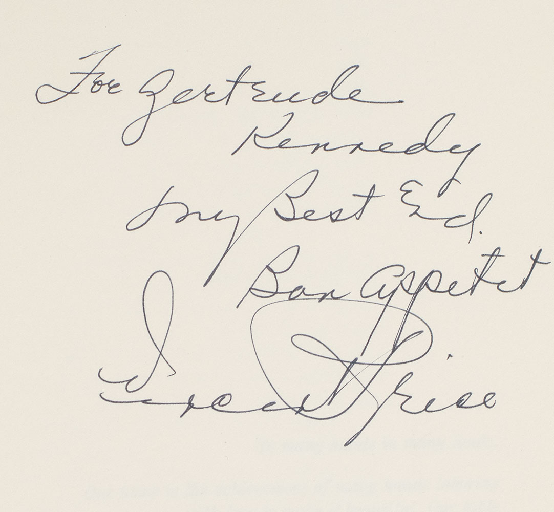 First edition of this classic cookbook, which gives a detailed portrait of world famous restaurants that includes menus, pictures and recipes. Folio, padded copper leatherette with gilt lettering and decorations, pictorial endpapers, silk bookmark. Illustrated by Fritz Kredel. Presentation copy, inscribed by Vincent Price, "For Gertrude Kennedy My Best and Bon Appetit Vincent Price." Edited by Darlene Geis. Recipes tested by Ann Seranne. Designed by Arthur Hawkins. Introduction by Cleveland Amory. In near fine condition, with the original acetate jacket. Uncommon in this condition and signed.