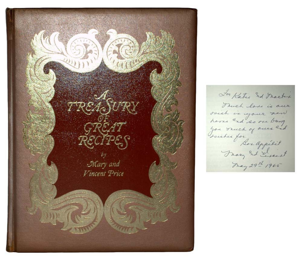 First edition. Folio, padded copper leatherette with gilt lettering and decorations. Inscribed in Vincent Price's hand, "For _____ and ______ much love is our wish in your new house and so we bring you much of ours and wishes for Bon Appetit Mary and Vincent May 29th 1965". In very good condition with the original acetate jacket showing wear.