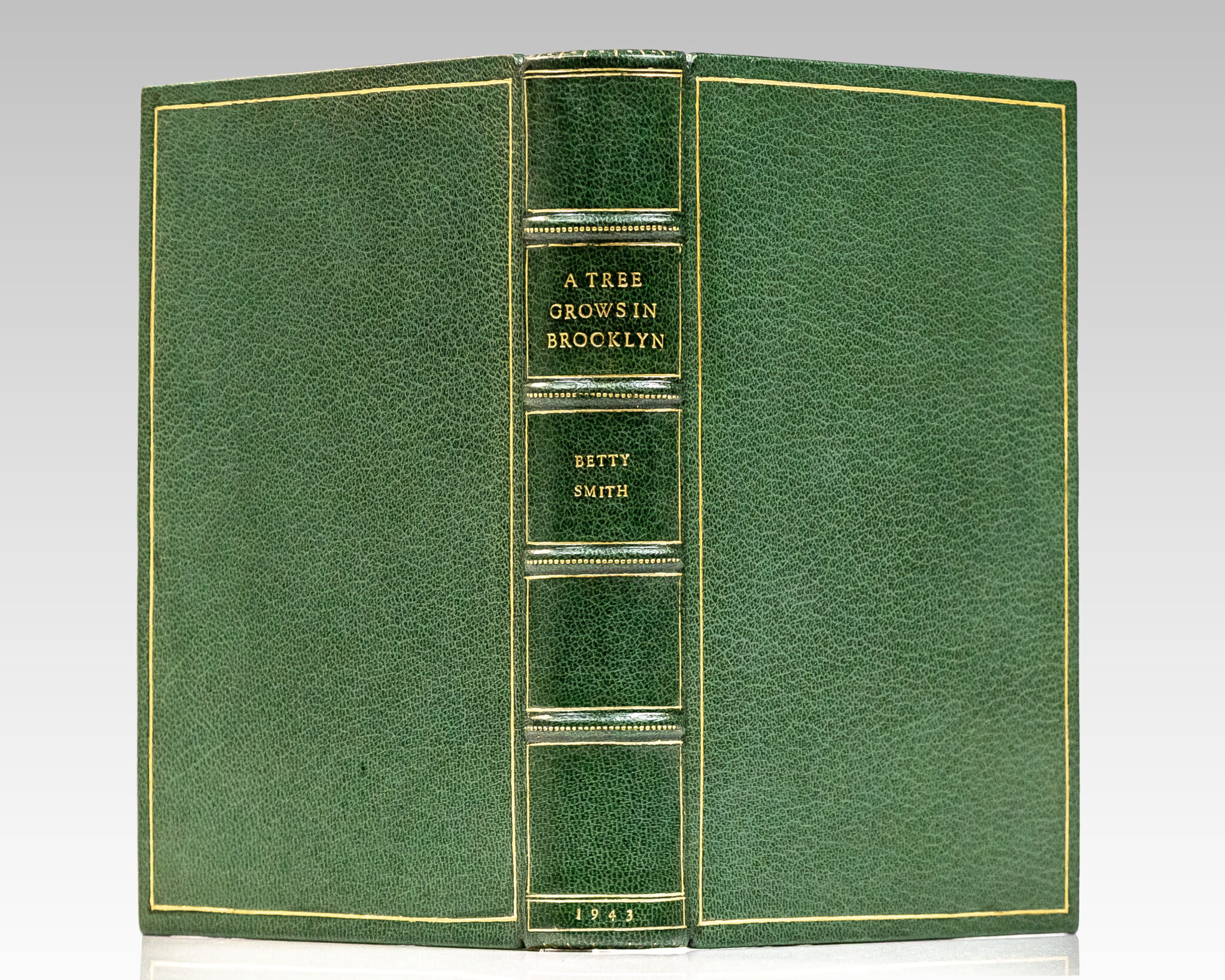 First edition of Smith's classic first novel. Octavo, bound in full morocco by the Harcourt Bindery with gilt titles and tooling to the spine in six compartments within raised gilt bands, gilt ruling to the front and rear panel, gilt inner dentelles stamp-signed by the Harcourt Bindery, marbled endpapers, all edges gilt in 22 karat gold. Inscribed by Betty Smith on a page bound in. Founded over a century ago in 1900, the Harcourt Bindery is the oldest and largest traditional bindery in America exclusively devoted to fine traditional leather bookbinding by hand. In fine condition. An exceptional presentation.