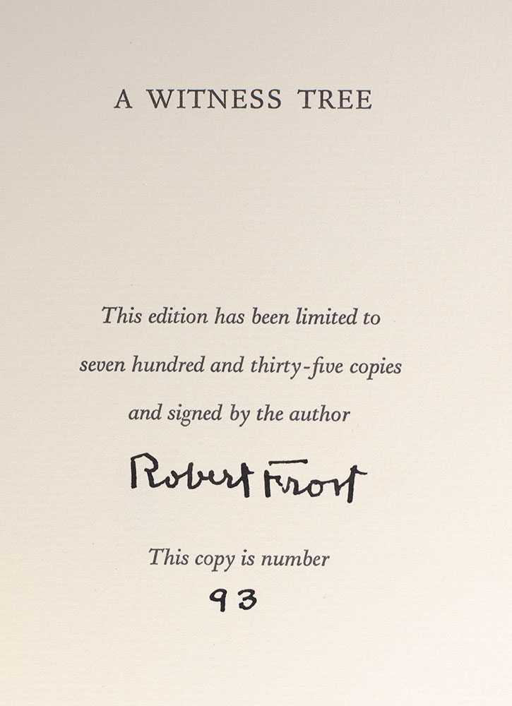 “Who would you be, I wonder, by those marks If I had moths to friend as I have flowers?”: Signed Limited Edition of Robert Frost's A Witness Tree