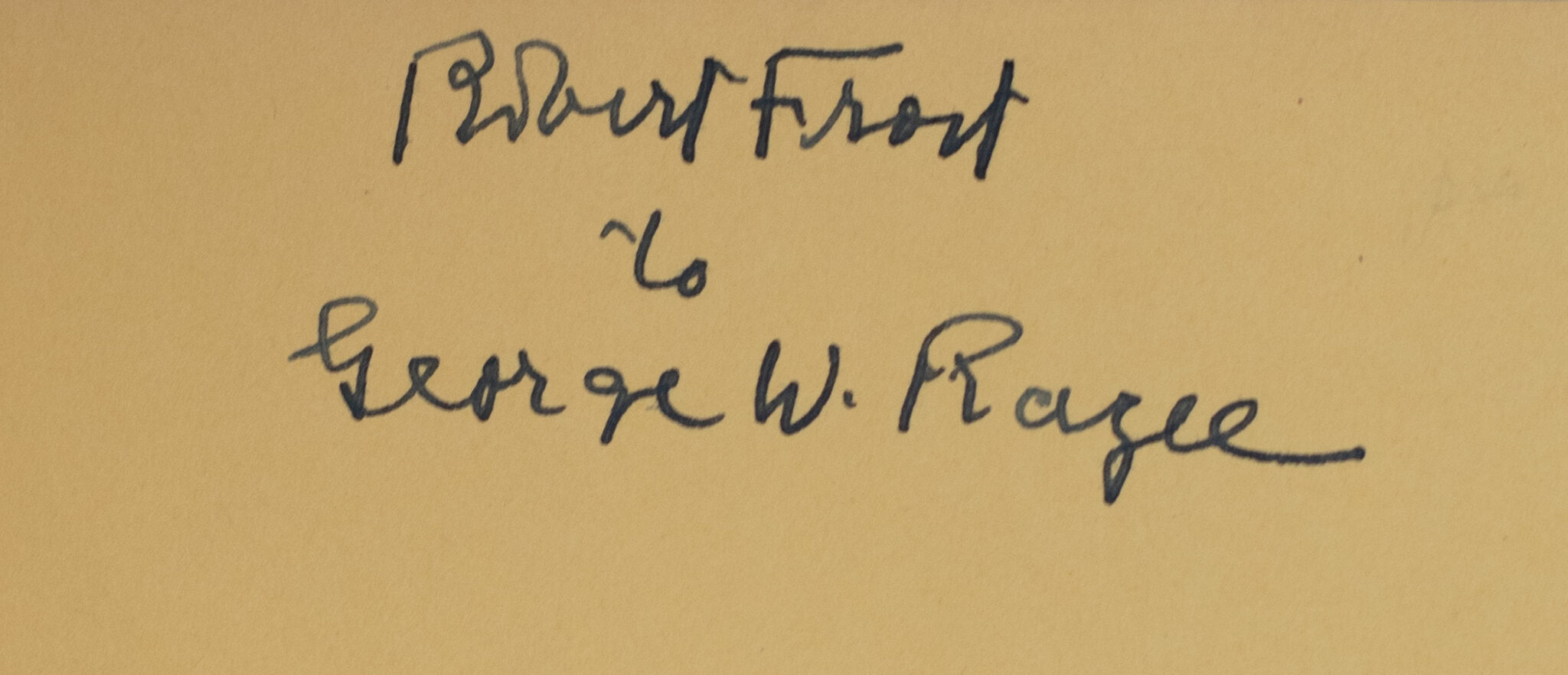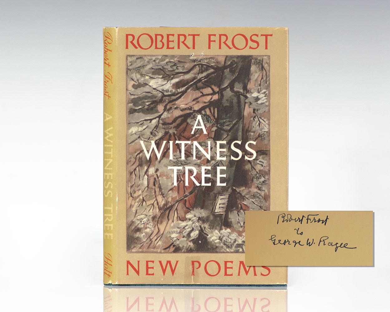 First edition of Frost's Pulitzer Prize-winning collection of poetry. Octavo, original cloth, engraved frontispiece portrait of Frost. Presentation copy, inscribed by the author on the front free endpaper, "Robert Frost to George W. Ragee." Near fine in a very good dust jacket. Jacket design by Alan Haemer.
