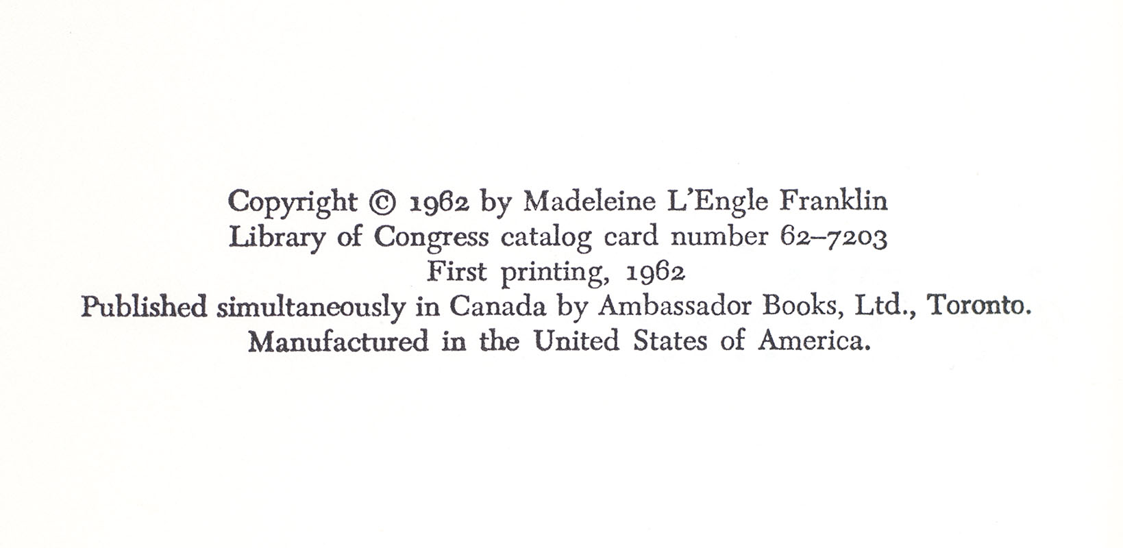 First edition of L'Engle's Newbery award-winning novel. Octavo, original half blue cloth. Near fine in a very good first issue dust jacket with some light rubbing to the crown of the spine. Without the Newbery Award winning seal to the front panel. Jacket design by Ellen Raskin. A nice example.