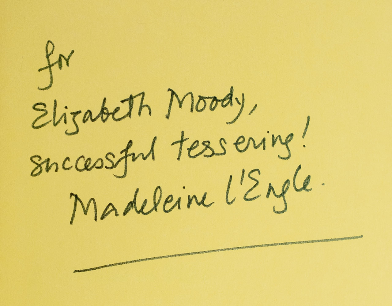 Later printing of the author's Newbery award-winning novel. Octavo, original cloth. Presentation copy, inscribed by the author on the front free endpaper, "For Elizabeth Moody, successful tessering! Madeleine L'Engle." Fine in a near fine dust jacket. Jacket design by Ellen Raskin.