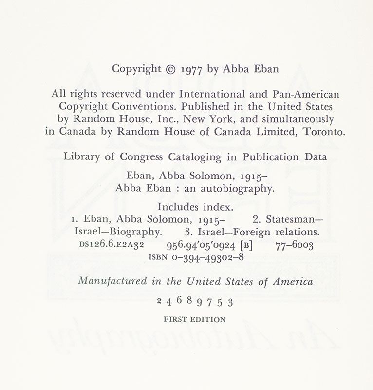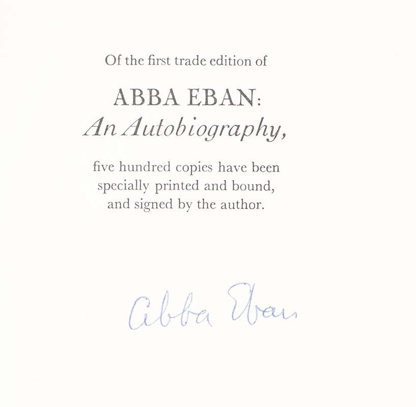 Signed limited first edition of Eban's autobiography. Octavo, original cloth. One of 500 copies signed by Abba Eban. Fine in a fine slipcase.