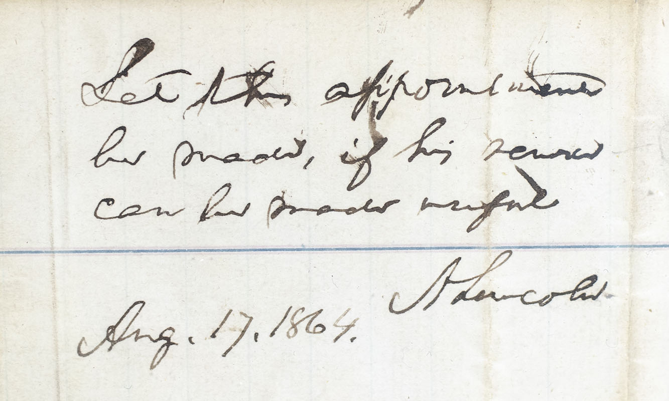 Rare Civil War era military endorsement signed by Abraham Lincoln as President. Two pages, the appointment is dated July 26th 1864, addressed to Secretary of War Edward M. Stanton and contains a request from J.M. Francis of Hudson County, New Jersey that Edward Z. Laurence be appointed Secretary of Subsistence in the Volunteer Army of the United States. The request is approved and endorsed at the conclusion by Lincoln, "Let the appointment be made, if his service can be made useful A. Lincoln Aug. 17 1864." Framed. The entire piece measures 27 inches by 9.5 inches. In very good condition with a bold inscription from Lincoln.