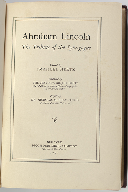 Emanuel Hertz's Abraham Lincoln: The Tribute of the Synagogue brings together dozens of tributes delivered by Jewish authors and Rabbis upon the occasion of Lincoln's death, including Rabbi Max Schlesinger's Abraham Lincoln (April 19, 1865), Levi A. Eliel's Leaders of Men (February 12, 1897), Rabbi Leonard Levy's The Message of Lincoln (February 12, 1911), and Rabbi Maurice H. Harris' The Humanity of Lincoln (February 12, 1916) among many others.