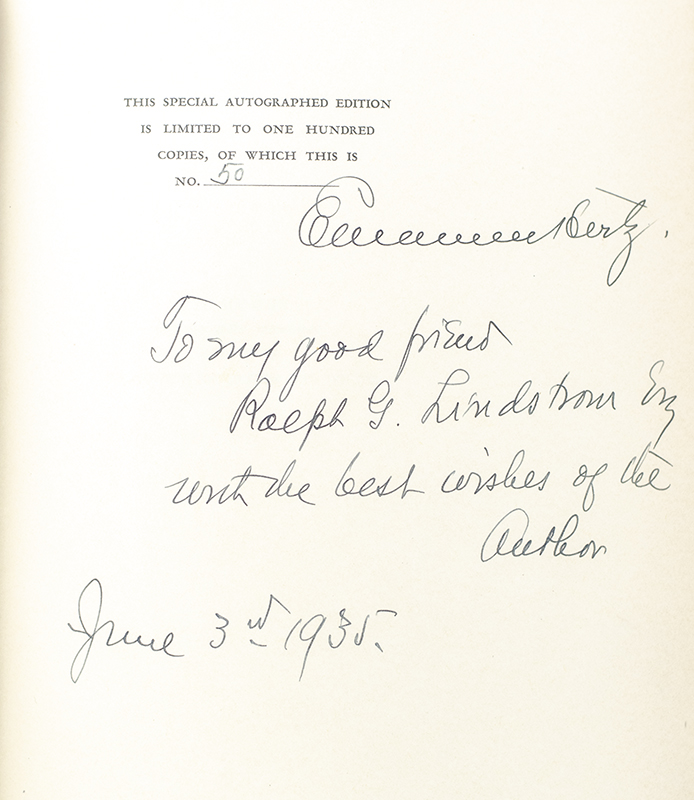 First edition and signed limited edition of Hertz's compilation of tributes delivered upon the occasion of the death of President Lincoln. Quarto, bound in three quarter morocco over buckram with gilt titles to the spine, tissue-guarded frontispiece portrait of Lincoln, illustrated. One of one hundred numbered copies signed by the author on the limitation page this is number 50. Presentation copy, additionally inscribed by the author on the limitation page, "To my good friend Ralph G. Lindstrom Esq with the best wishes of the Author June 3rd 1935." The recipient, Ralph G. Lindstrom was a noted Civil War and Lincoln scholar. Foreword by Rev. Dr. J. H. Hertz. Introduction by Dr. Nicholas Murray Butler. In fine condition. Very rare with noted provenance.