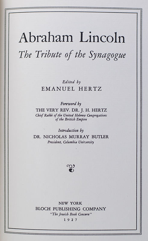 Emanuel Hertz's Abraham Lincoln: The Tribute of the Synagogue brings together dozens of tributes delivered by Jewish authors and Rabbis including Rabbi Max Schlesinger's Abraham Lincoln (April 19, 1865), Levi A. Eliel's Leaders of Men (February 12, 1897), Rabbi Leonard Levy's The Message of Lincoln (February 12, 1911), and Rabbi Maurice H. Harris' The Humanity of Lincoln (February 12, 1916) among many others.