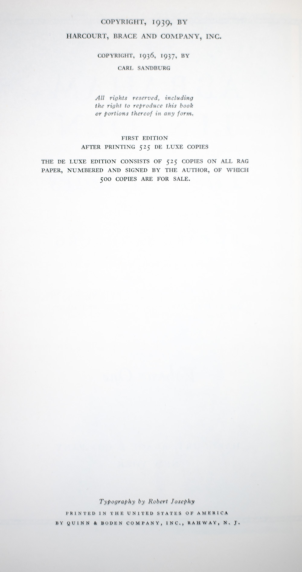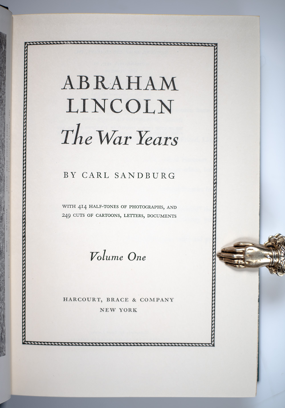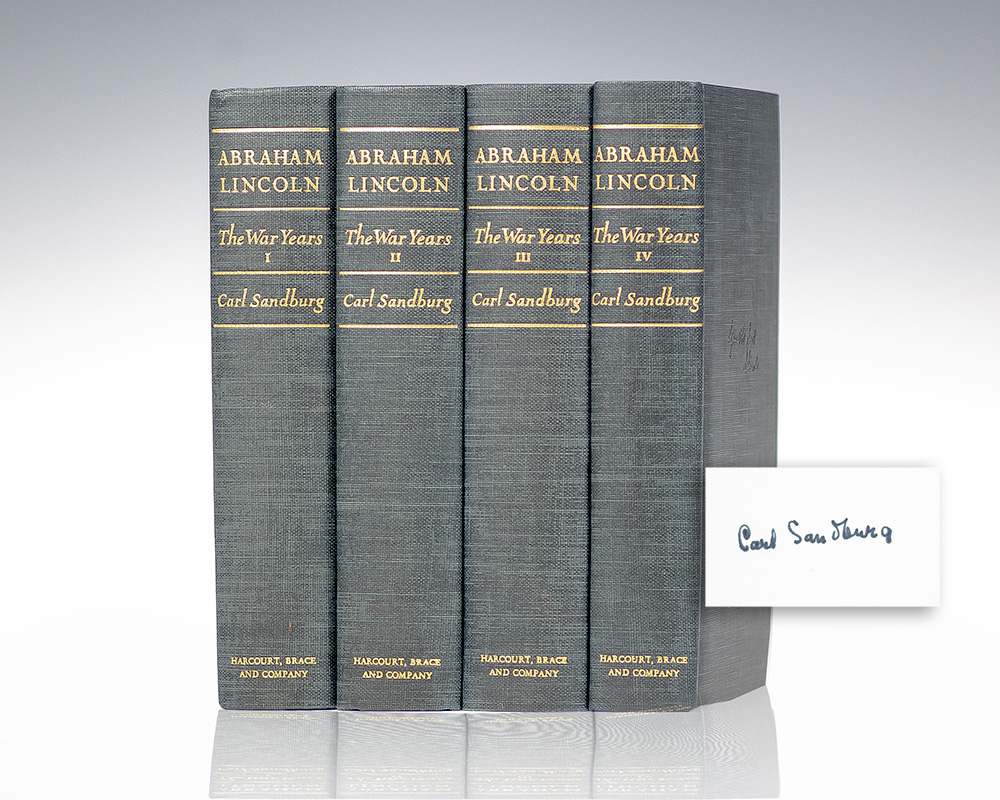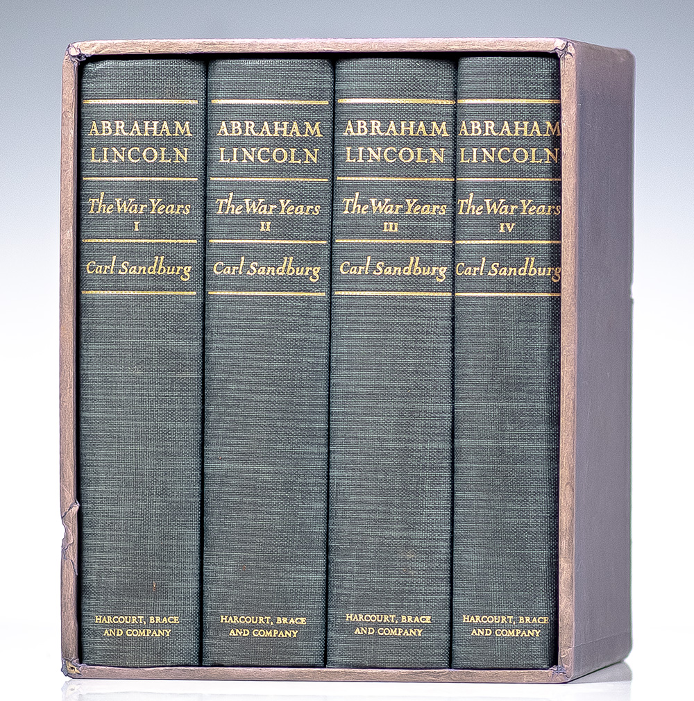 First trade edition of Sandburg's Pulitzer Prize-winning work. Octavo, four volumes, original publisher's cloth, illustrated with 414 half-tones of photographs and 249 cuts of cartoons, letters and documents. Signed by Carl Sandburg on the half-title page of volume one. In near fine condition. Housed in a original slipcase. An exceptional signed example.