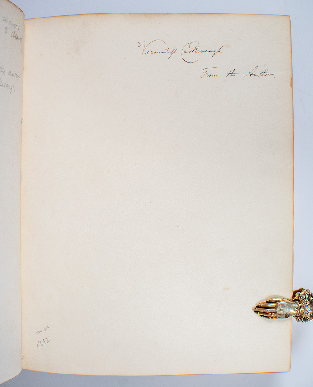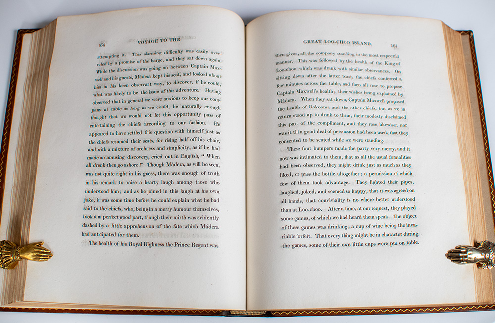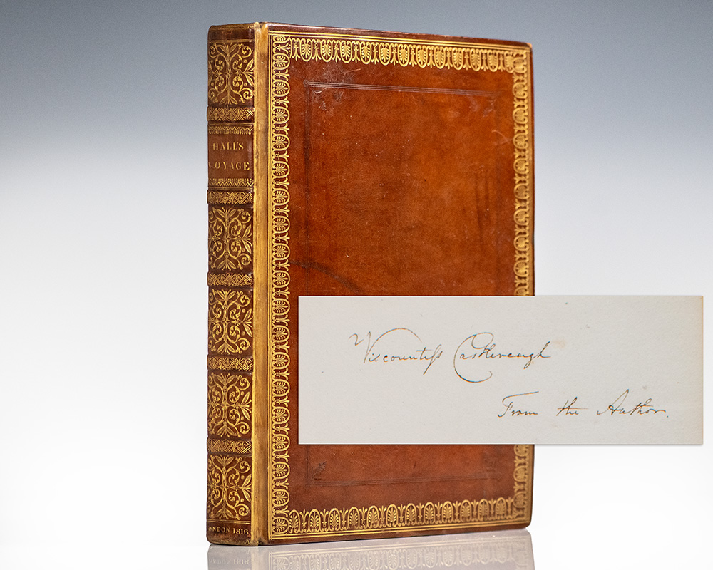 First edition, presentation copy of Hall’s important early nineteenth-century travel narrative documenting his 1816 expedition, one of the first detailed Western accounts of Korea and the Ryukyu Islands then largely unknown to Europe. Quarto, bound in full contemporary polished calf with gilt titles and elaborate gilt tooling to the spine in six compartments within raised gilt bands, double gilt ruling and scrolling to the front and rear panels, gilt-ruled turn-ins and inner dentelles, illustrated with 8 tissue-guarded aquatint plates with hand coloring by William Havell including frontispiece, one uncolored aquatint, 5 engraved maps (2 folding), and one engraved plate. Presentation copy, inscribed by the author on the front free endpaper, "Viscountess Castlereagh From the Author." The recipient, Amelia Stewart, Viscountess Castlereagh (1772-1829), was the wife of Robert Stewart, better known as Viscount Castlereagh (later the 2nd Marquess of Londonderry), Britain's leading diplomat during the close of the Napoleonic Wars. As Foreign Secretary from 1812 until his death in 1822, Castlereagh was instrumental in forging the alliances that led to Napoleon’s defeat, demonstrating both strategic pragmatism and a commitment to maintaining a balance of power. His participation at the Congress of Vienna (1814–1815) marked the high point of his career, where he successfully defended Britain’s maritime and colonial interests while promoting a framework of collective security among the great powers. Although often criticized by contemporaries for his aloof manner and repressive domestic policies, historians have emphasized his diplomatic skill and long-term vision in establishing the Concert of Europe, a system that provided relative stability on the continent for nearly a century. In near fine condition. A very fine example in a stunning period binding and with noted provenance.