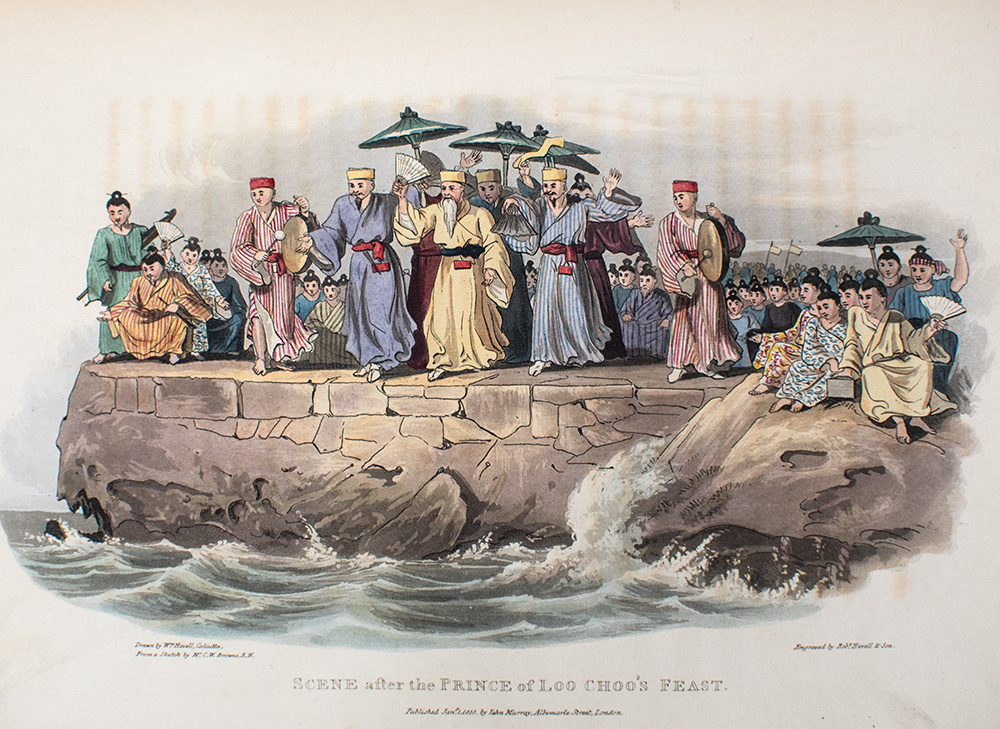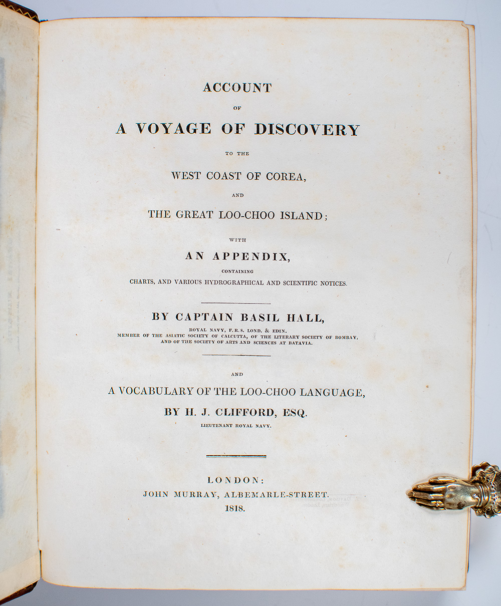 Basil Hall entered the British navy in 1801, and in 1815 "was appointed to the Lyra and ordered to China where, in consort with the Alceste, he accompanied Lord Amherst's embassy to China" (Howgego). The expedition "explored the relatively little-known East China Sea and the Yellow Sea. Visits were made to Korea and the Ryukyu Archipelago. Korea had been sketchily explored by the Europeans, but it was not until the Alceste and Lyra expedition in 1816-17, under Captains Murray Maxwell and Basil Hall, that detailed information was obtained about the Ryukyus" (Hill). According to Abbey, Hall's work was met with enthusiasm by the Edinburgh Review: "We do not know when we have met with a more pleasing work than this delightful account of the people of Loo-Choo... [It] makes us proud of our country, and puts us in good humour with our species." Abbey Travel, 558; Cordier Sinica 3009.