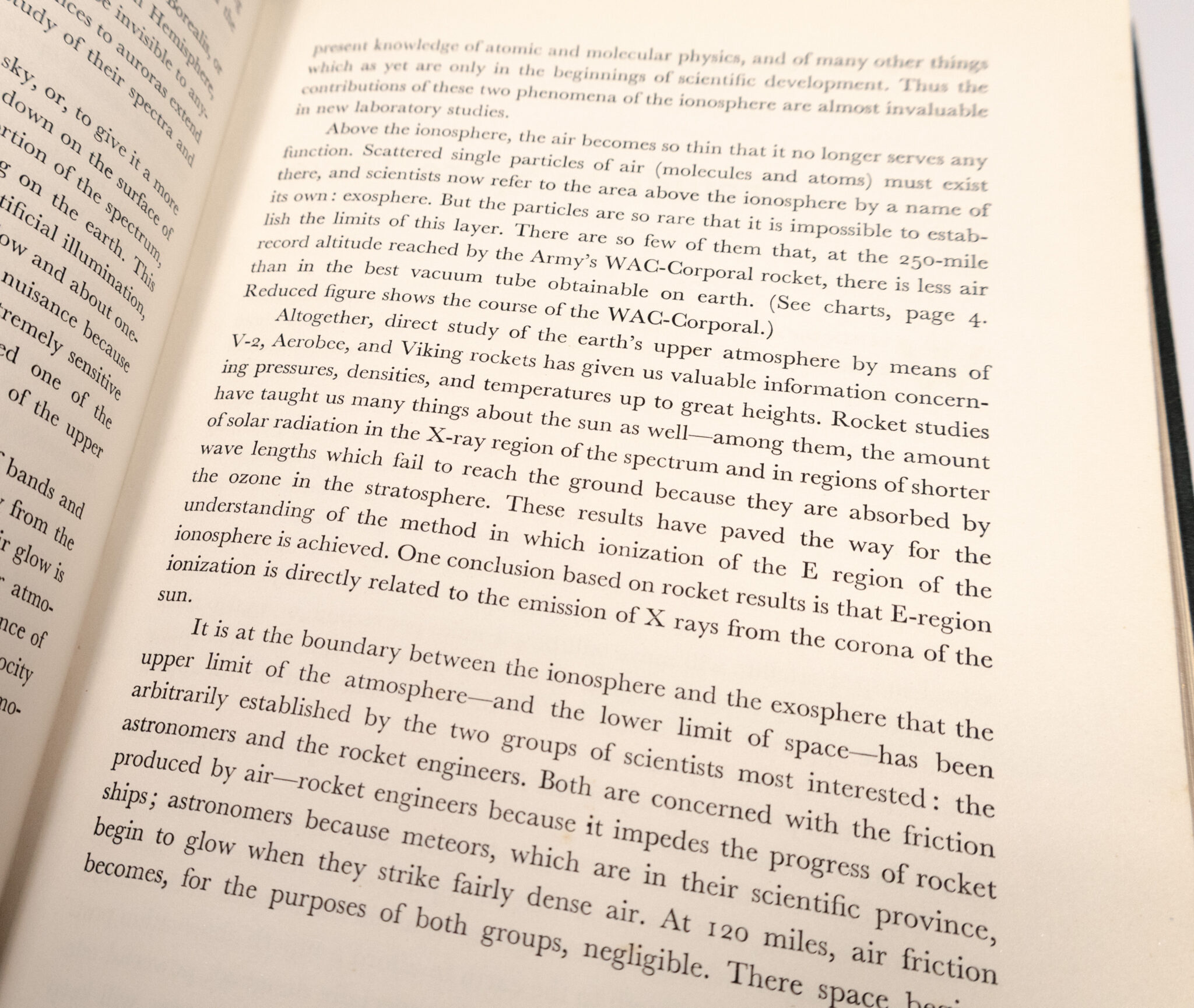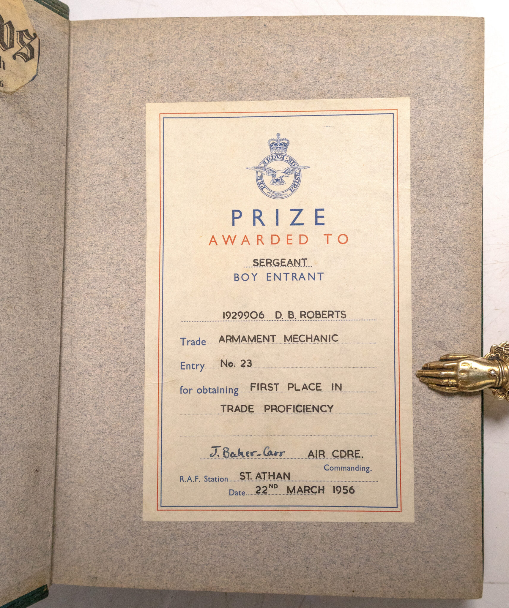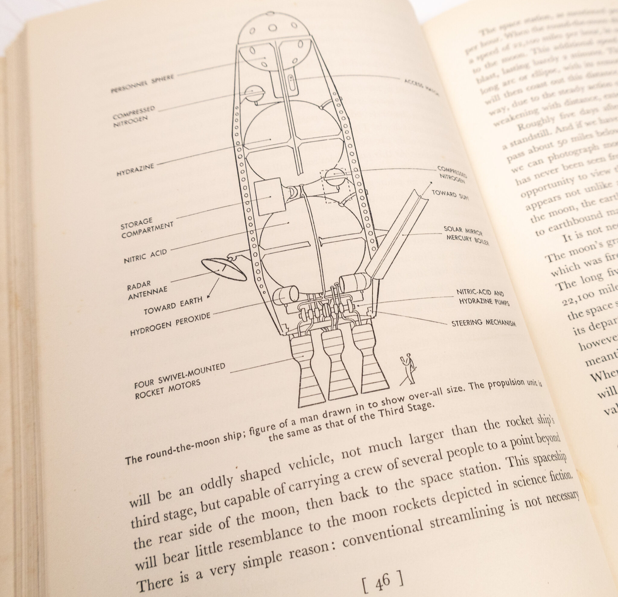First edition of this early collaborative exploration of the scientific, technical, and legal possibilities of space travel. Royal octavo, bound in full morocco with gilt titles and tooling to the spine in three compartments within raised gilt bands, double gilt ruling and the motif for the Royal Air Force St. Athan stamped in gilt to the front panel, all edges gilt, gilt turn-ins, inner dentelles stamped in blind, illustrated throughout. In very good condition. Illustrated by Chesley Bonestell, Fred Freeman, and Rolf Klep. Edited by Cornelius Ryan. Foreword by the Astronomer Royal, Sir Harold Spencer Jones. Original prize plate from the R.A.F. Station in St. Athan dated 1953 affixed to the front free endpaper. Newspaper clippings about the awarded prize adhered to the front pastedown.