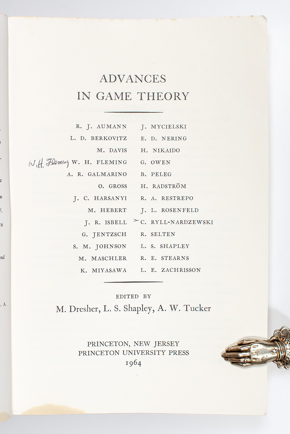 First edition of collection of papers on game theory. Octavo, original wrappers. Signed by mathematician W.H. Fleming on the title page, next to his name. Wendell Helms Fleming was a mathematician, specializing in geometrical analysis and stochastic differential equations. Fleming received in 1951 his PhD under Laurence Chisholm Young at the University of Wisconsin–Madison with a thesis entitled Boundary and related notions for generalized parametric surfaces. Fleming was a professor at Brown University, where he retired in 2009 as professor emeritus. Fleming was with Herbert Federer a pioneer of geometric measure theory. Later in his career, he worked on stochastic processes, stochastic differential equations and their applications in control theory. In 1976–1977 he was a Guggenheim Fellow. In 1982 he gave a plenary address (Optimal control of Markov Processes) at the ICM in Warsaw. In very good condition.