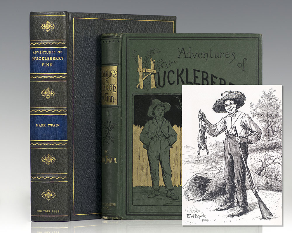 First edition of Twain's masterpiece. Octavo, original publisher’s decorated green cloth gilt to the spine and front panel. Profusely illustrated by E.W. Kemble. Numerous early state points, including: frontispiece portrait first state, title-leaf presumed second state; page 13 first state, page 57 first state, page 155 first state. Housed in a full custom morocco clamshell box. An unusually bright example.