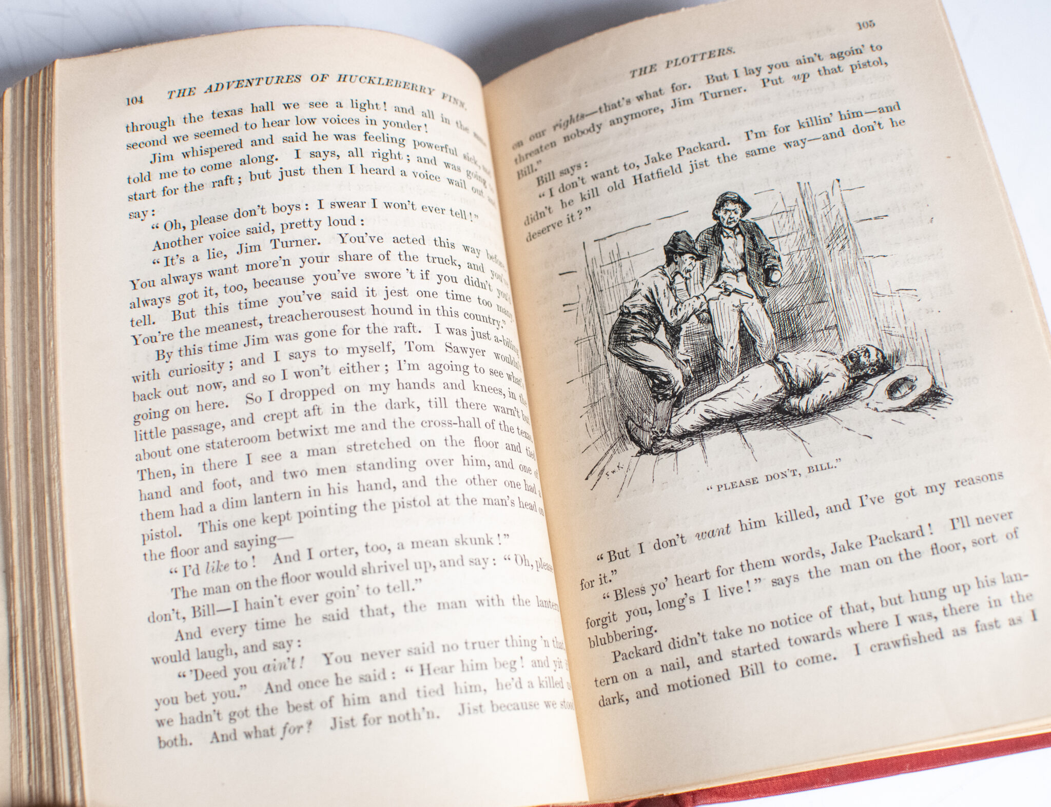 First English edition, first issue, preceding the first American edition of "the most praised and most condemned 19th-century American work of fiction" (Legacies of Genius). Octavo, original decorative red cloth stamped in black and lettered in gilt, patterned endpapers, illustrated with 174 drawings by E.W. Kemble. The English edition of Huckleberry Finn preceded the American by a few months and was made from sheets sent by the publisher of the American edition, Charles Webster. In very good condition. A sharp example.