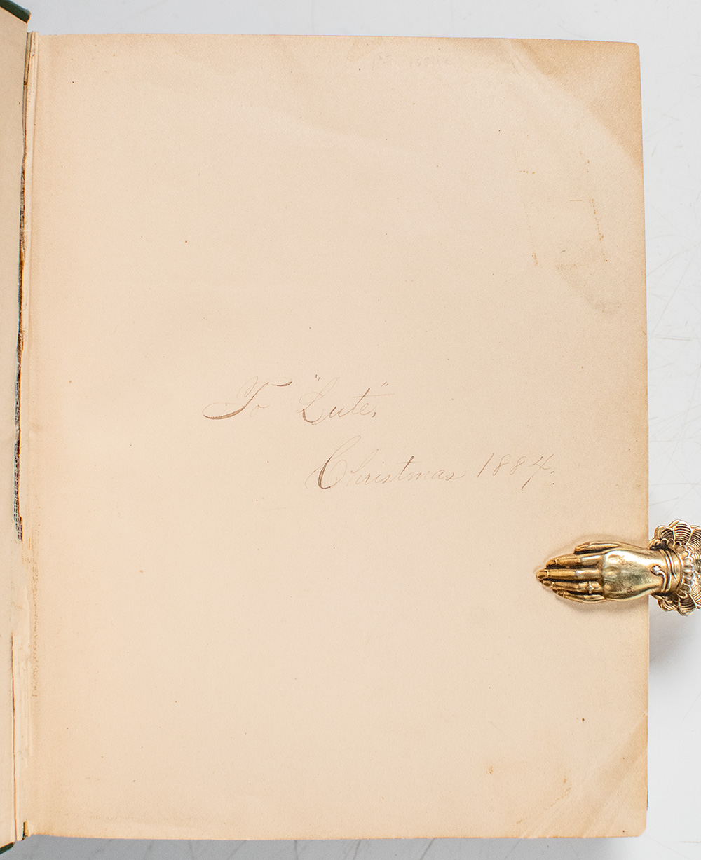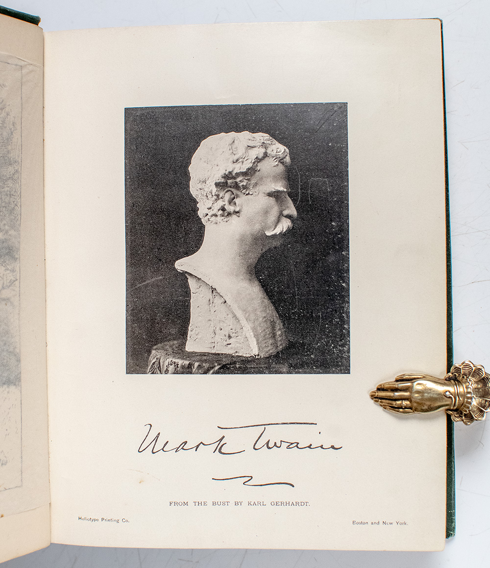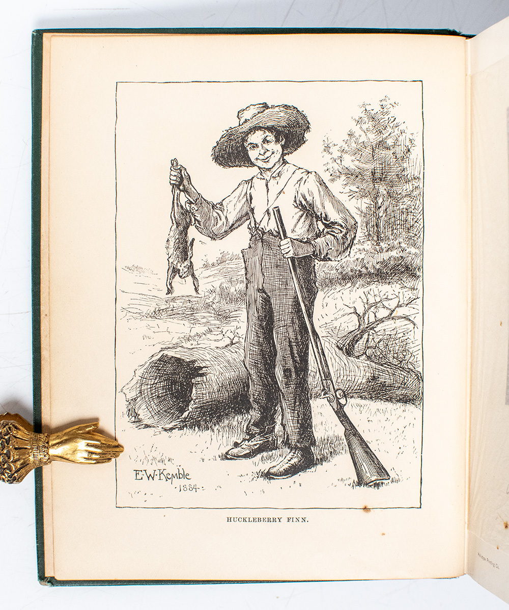 First edition, earliest possible issue confirmed by a contemporary 1884 gift inscription of Mark Twain’s masterpiece, a justifiable contender for the title of "the Great American Novel" and arguably "the most praised and most condemned 19th-century American work of fiction" (Legacies of Genius, 47). Octavo, original publisher’s gilt and black stamped pictorial green cloth, with 174 illustrations by Edward W. Kemble. Contains all of the agreed upon first issue points for the clothbound book: page 9 with “Decided” remaining uncorrected (to “Decides”); page 13, illustration captioned “Him and another Man” listed as on page 88; page 57, 11th line from bottom reads “with the was,” instead of “with the saw." Other points of bibliographical interest included in this copy are the frontispiece portrait in first state with the cloth table cover under the bust, bearing the Heliotype Printing Co. imprint; copyright page dated 1884; page 143 with “l” missing from “Col.” at top of illustration and with broken “b” in “body” on line seven; page 155 with a larger final “5”; page 161, no signature mark “11”. As to issue points resulting from damaged plates (e.g. the dropped “5” on p 155), MacDonnell concludes, “they are of no significance in determining the sequence of the printing of the sheets. All of these occur at random in relation to each other within copies of the first printing, a strong indicator of the use of multiple plates, and possibly mixed sheets within the collating process” (“Huck Finn” Firsts Magazine). Contemporary gift inscription to the front free endpaper, "To 'Lute', Christmas 1884." First editions of Adventures of Huckleberry Finn present an array of issue points and an absolute priority of issue has been difficult to establish. The present copy, however, is one of just a handful of copies presented to those associated with the publication of the work that were given as Christmas gifts in 1884, significantly in advance of the February 16ht 1885 publication date. Even review copies were not generally distributed much before the publication date, as Clemens warned Webster to "send no copy of the book to any newspaper until after the Century or the Atlantic shall have reviewed it" (Clemens to Webster, 27 January 1885). While the recipient of this copy has not been identified, he must have been related to someone employed in the Webster publishing firm. (Two other copies with 1884 Christmas gift inscriptions are both inscribed by Webster himself). Accompanied by an extensive forensic report by Dr. Joe Nickell, the noted document examiner, which concludes that the inscription on the endpaper is genuine. In very good condition with wear and minor losses to the crown and foot of the spine, splitting to the gutters. Housed in a custom full morocco clamshell box. An exceptional example of this landmark work in American literature, one of only a handful of the earliest possible issue extant.