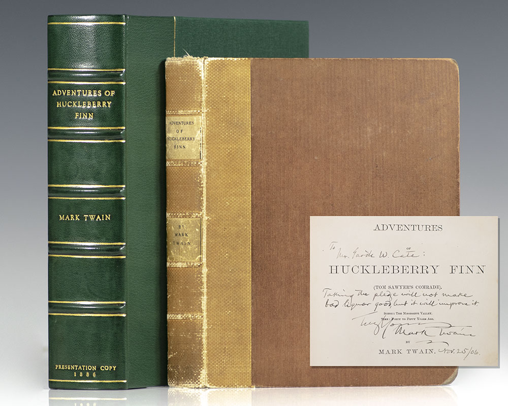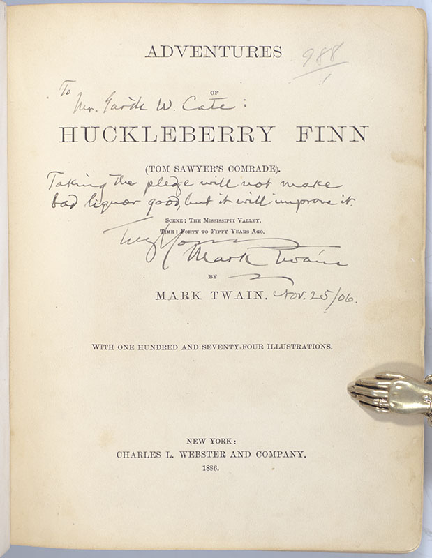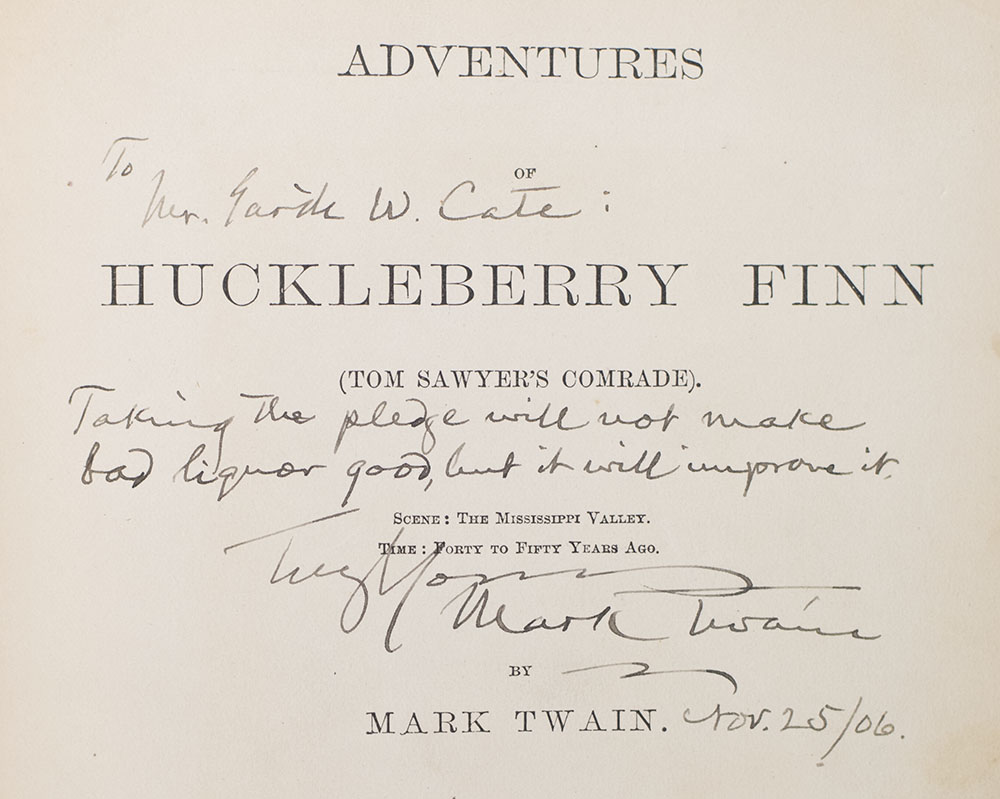 "Taking the pledge will not make bad liquor good, but it will improve it": The Adventures of Huckleberry Finn; inscribed by Mark Twain