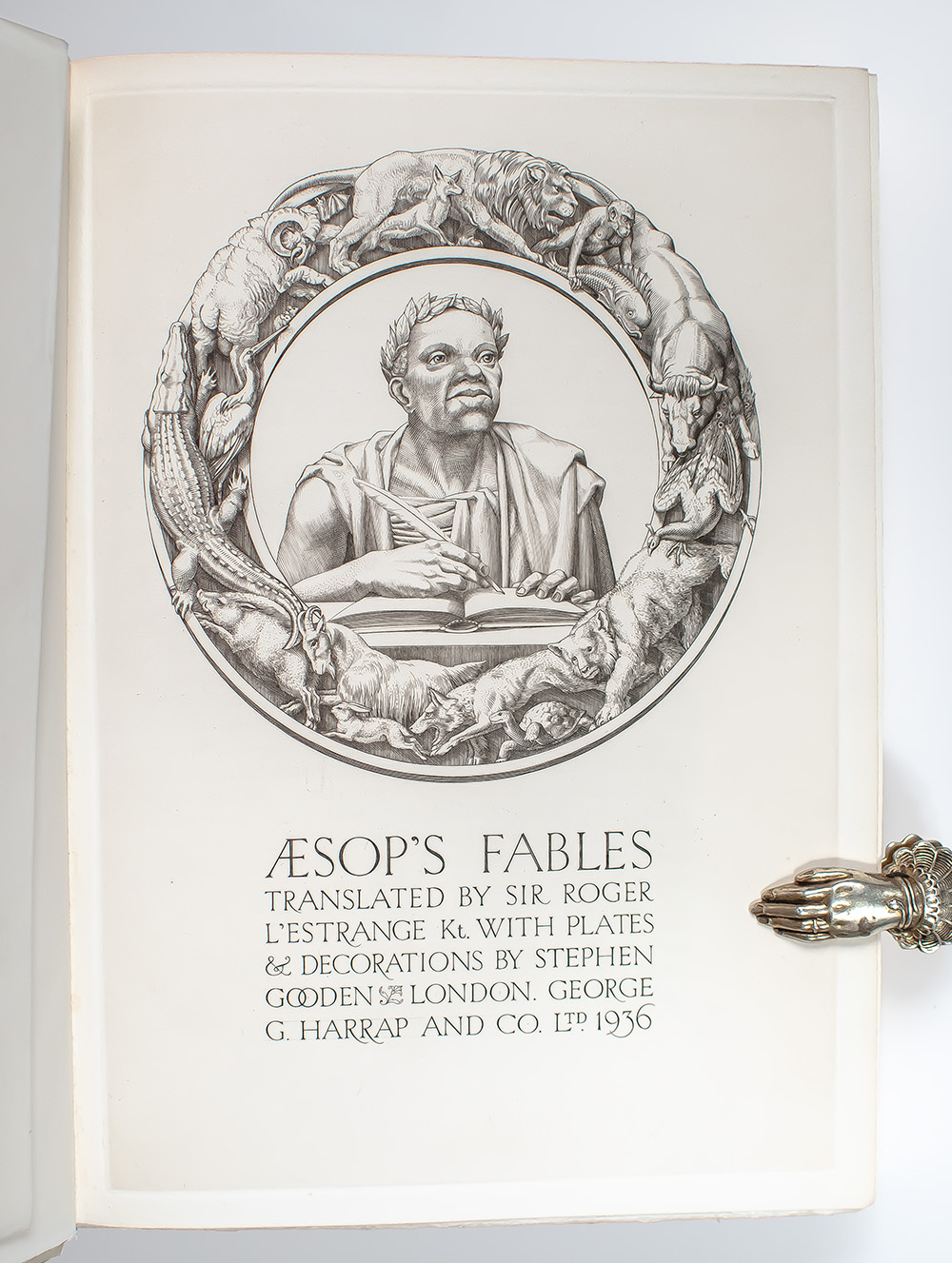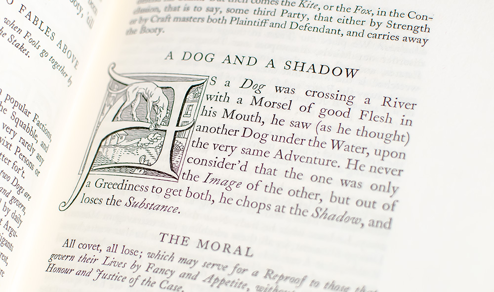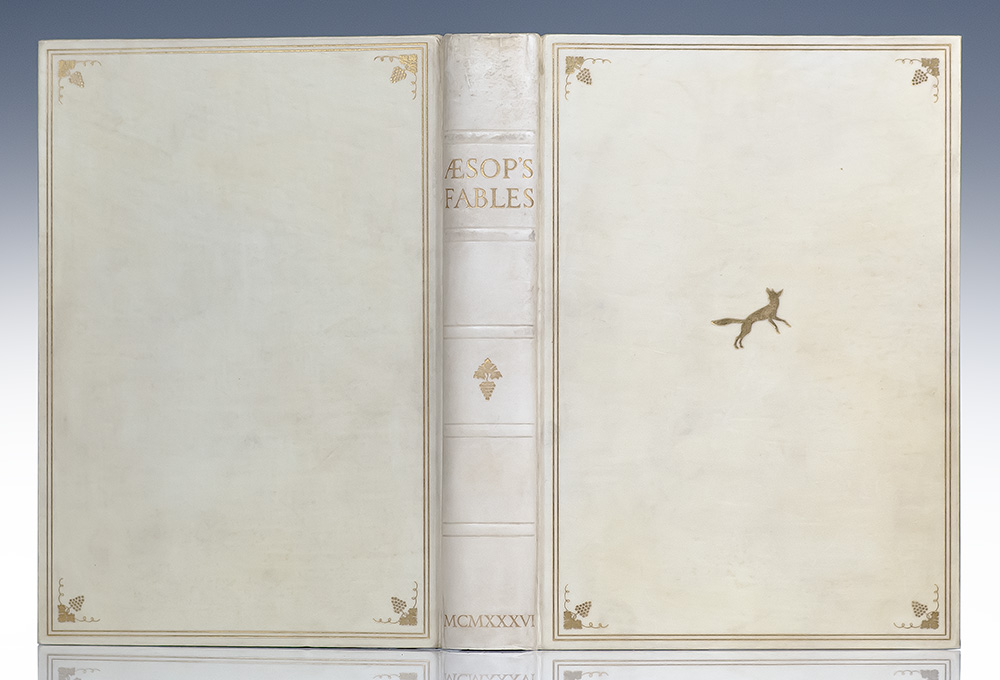 Signed limited edition of Aesop's Fables. Royal octavo, bound in full vellum with gilt titles and tooling to the spine in six compartments within raised bands, gilt ruling and detailing to the front and rear panels, marbled endpapers, vignette title-page, illustrated with engraved plates and decorations. Boldly signed by illustrator Stephen Gooden on the colophon page at the rear. One of 525 numbered copies, this is number 304. In fine condition. Translated by famous and influential translator Sir Roger L'estrange. Illustrated by Stephen Gooden. Housed in a custom cloth over vellum slipcase.