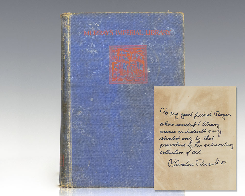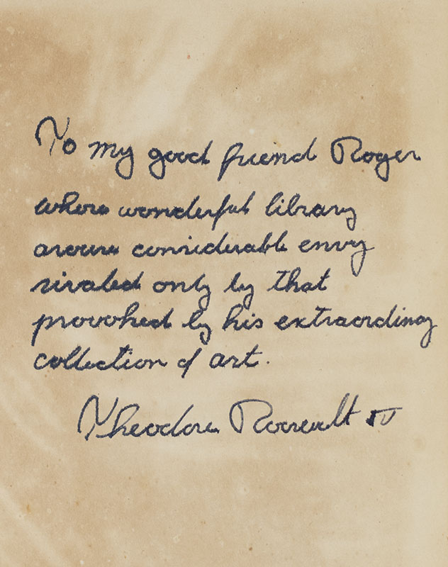 First Murray's Imperial Library edition of Roosevelt's classic work. Octavo, original cloth, with illustrations from drawings by Philip R. Goodwin and from photographs by Kermit Roosevelt and other members of the expedition including tissue-guarded engraved frontispiece portrait of Roosevelt and one of his big lions. Presentation copy, inscribed by President Roosevelt's great-grandson Theodore Roosevelt IV, "To my good friend Roger whose wonderful library arouses considerable envy rivaled only by that provoked by his extraordinary collection of art. Theodore Roosevelt IV." Laid in is Theodore Roosevelt IV's business card as managing director of Lehman Brothers which is also inscribed on the verso, "To my good friend Roger May our paths cross again in Africa. Ted Roosevelt IV." Theodore Roosevelt V, commonly known as Theodore Roosevelt IV, is an investment banker and managing director at Barclays Capital Corporation as well as a prominent conservationist. His name suffix varies since President Roosevelt's father was Theodore Roosevelt Sr., though the same-named son did not commonly use a "Jr" name suffix. In very good condition. Rare.