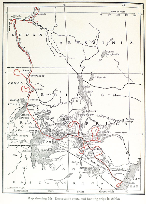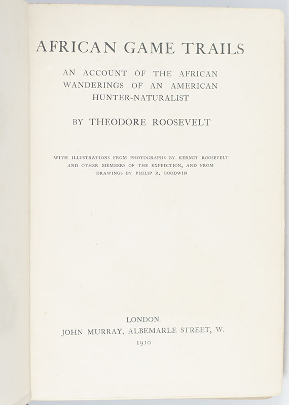 "One of the most famous of all big-game hunting epics, this, with its larger than life sportsmen, was almost continuously in print until the 1930s. In British East Africa, Roosevelt hunted lion and plains game on the Kapiti Plains, while, in the Bondoni hill country, he collected rhinoceros and giraffe. On Juja Farm, his son Kermit faced leopard, while Teddy bagged rhino and hippopotamus. On the Kamiti River, buffalo were taken. Near the Sotik, additional rhino and lion were hunted, with elephant bagged near Mt. Kenia. On the Guaso Nyiro, giraffe and a variety of plains game were shot. Further adventures included hunting elephant near Lake Nyanza, rhino and plains game in the Lado, and eland on the Nile. Roosevelt’s total bag was enormous even by the liberal standards of that era" (Czech, 138-39).