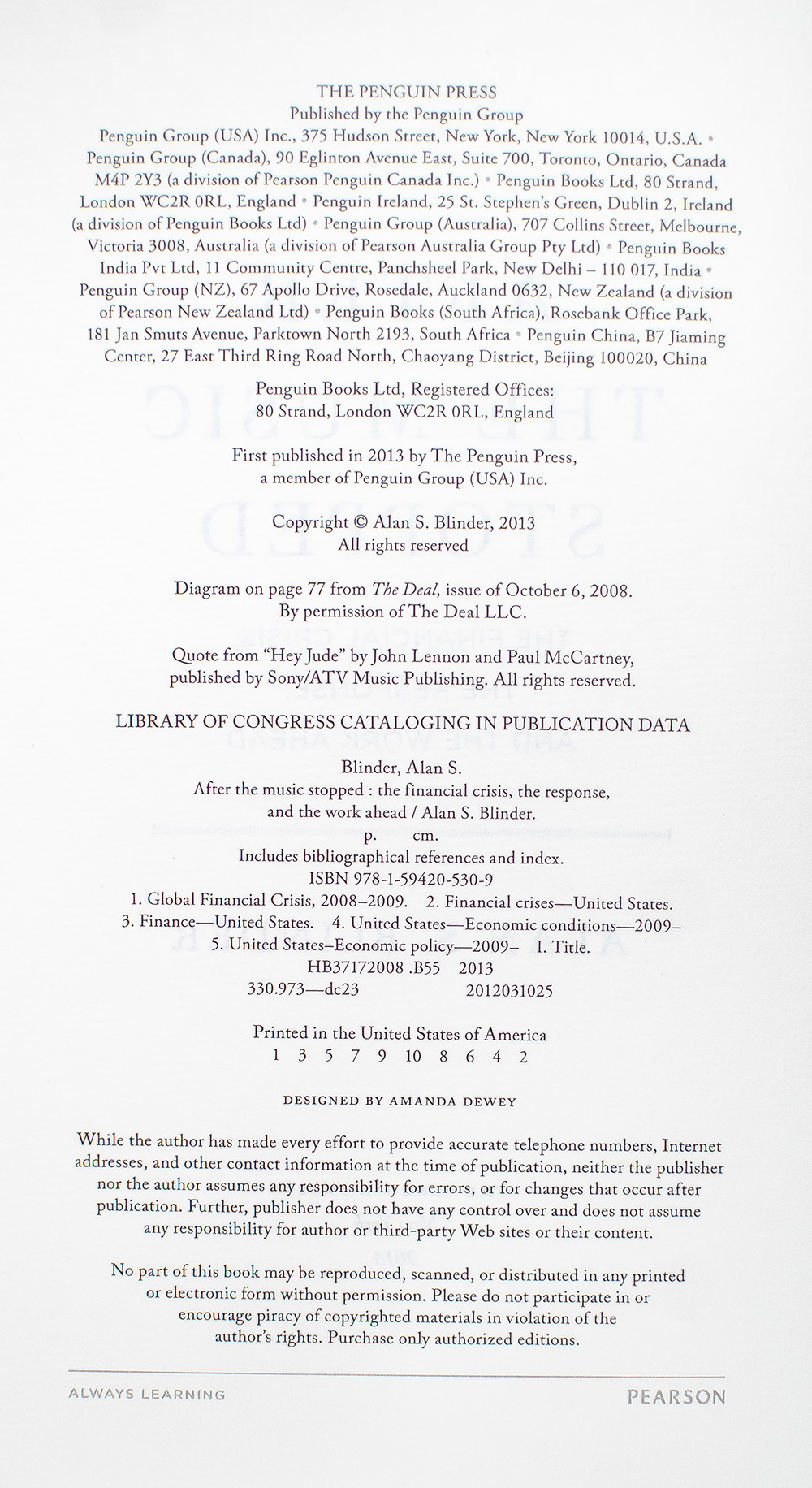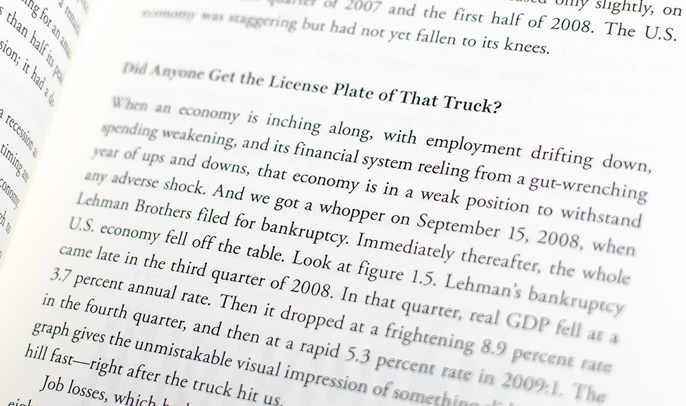 In After the Music Stopped, Alan S. Blinder analyzes the causes, consequences, and policy responses to the 2008 financial crisis. Blinder, a Princeton economist and former Federal Reserve official, attributes the crisis to excessive risk-taking in the financial sector, deregulation, subprime mortgage lending, and the proliferation of complex financial instruments. He critiques the failures of both private institutions and regulatory bodies in preventing the collapse.