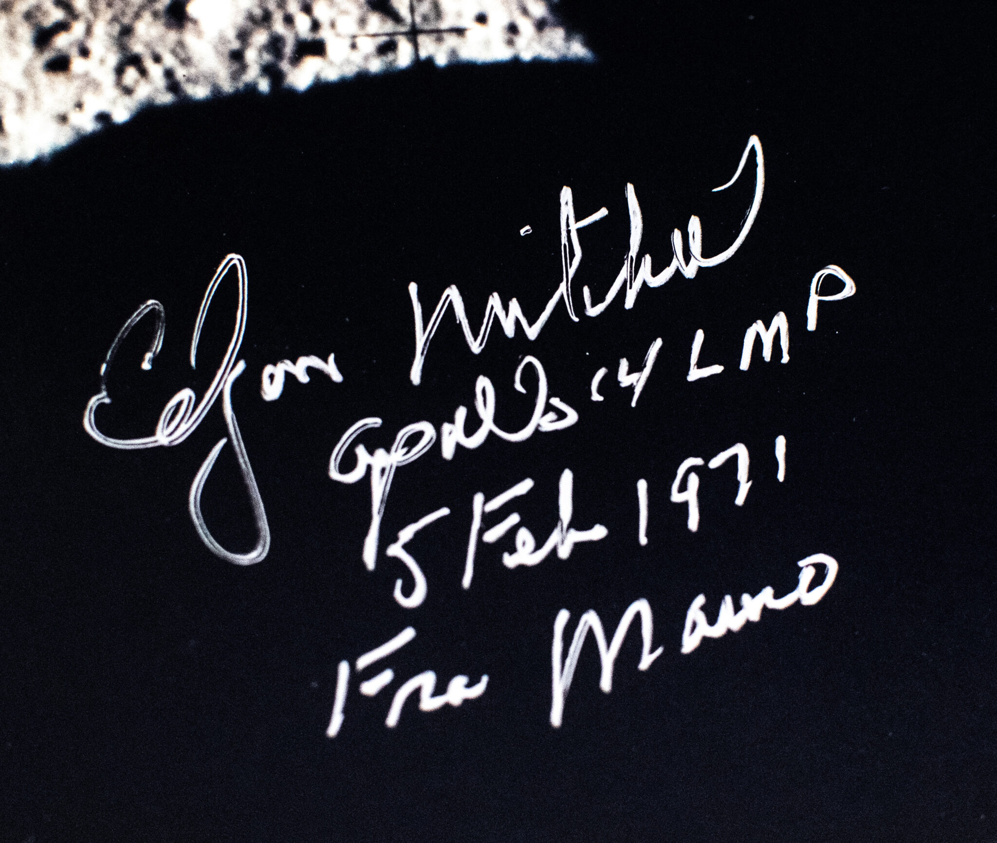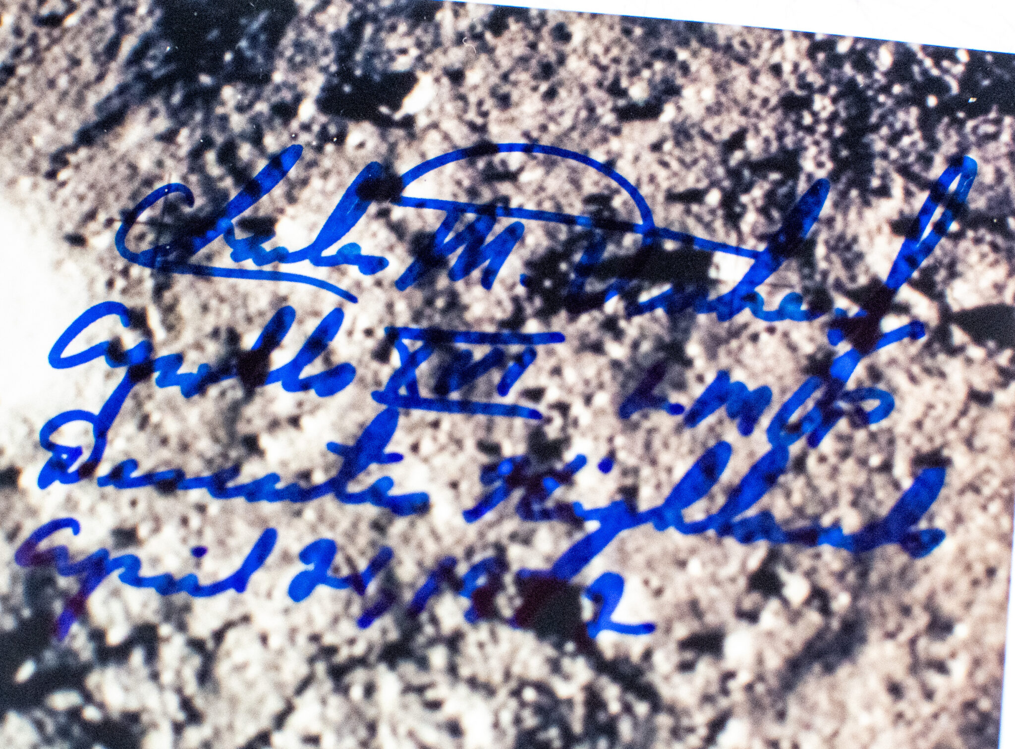 Rare photograph signed by moonwalkers Alan Bean, Edgar Mitchell, and Charlie Duke. Satin finish photograph of a lunar bootprint on the moon. Boldly signed by Bean in blue felt tip at the top left corner, "Alan Bean Apollo XII LMP Ocean of Storms 19 November 1969"; Mitchell in silver felt tip at the bottom left corner, "Edgar Mitchell Apollo 14 LMP 5 Feb. 1971 Fra Mauro"; and Duke in blue felt tip at the top right corner, "Charles M. Duke, Jr. Apollo XVI LMP Descartes Highlands April 21, 1972." In fine condition. The piece measures ten inches by eight inches.