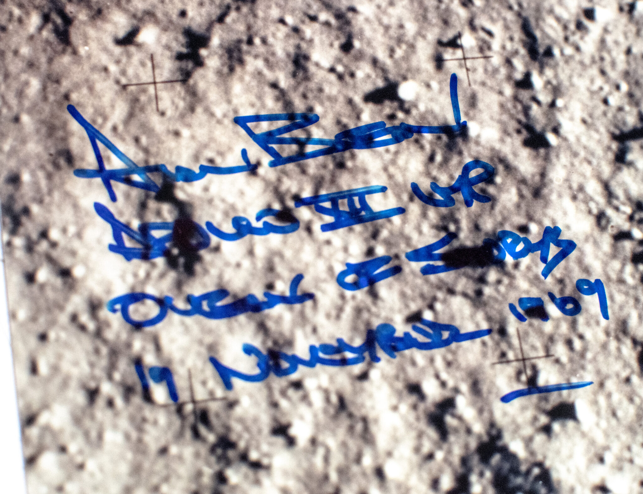 Rare Lunar Bootprint Photograph; Signed by Moonwalkers Alan Bean, Edgar Mitchell, and Charlie Duke