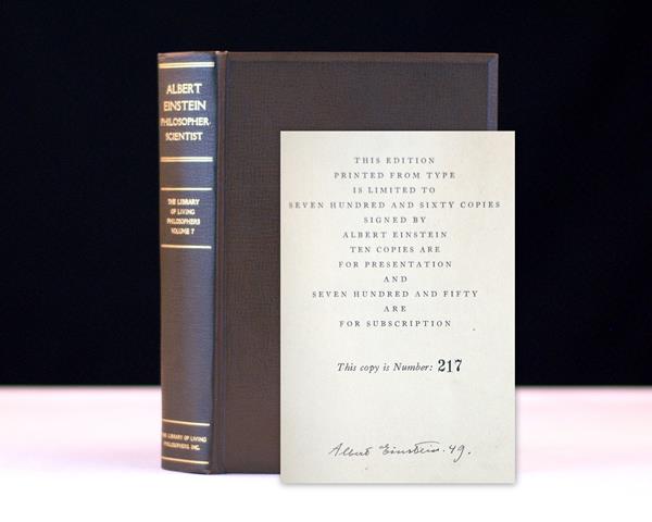 First edition, one of 760 copies signed and dated "Albert Einstein ‘49." Octavo, original brown cloth, top edge gilt, original slipcase. Housed in a custom half morocco clamshell box. The book is in near fine condition; the slipcase is in very good condition shows some of the usual rubbing. Edited by Paul Arthur Schhilpp.