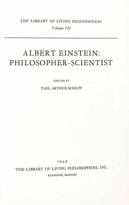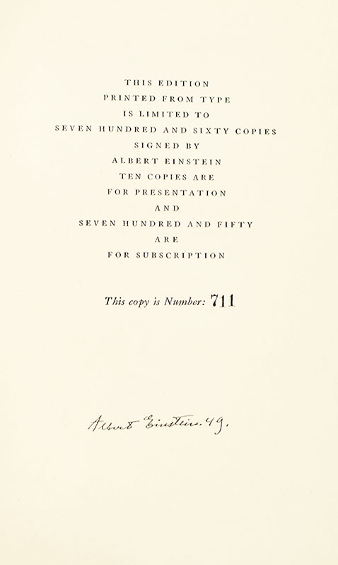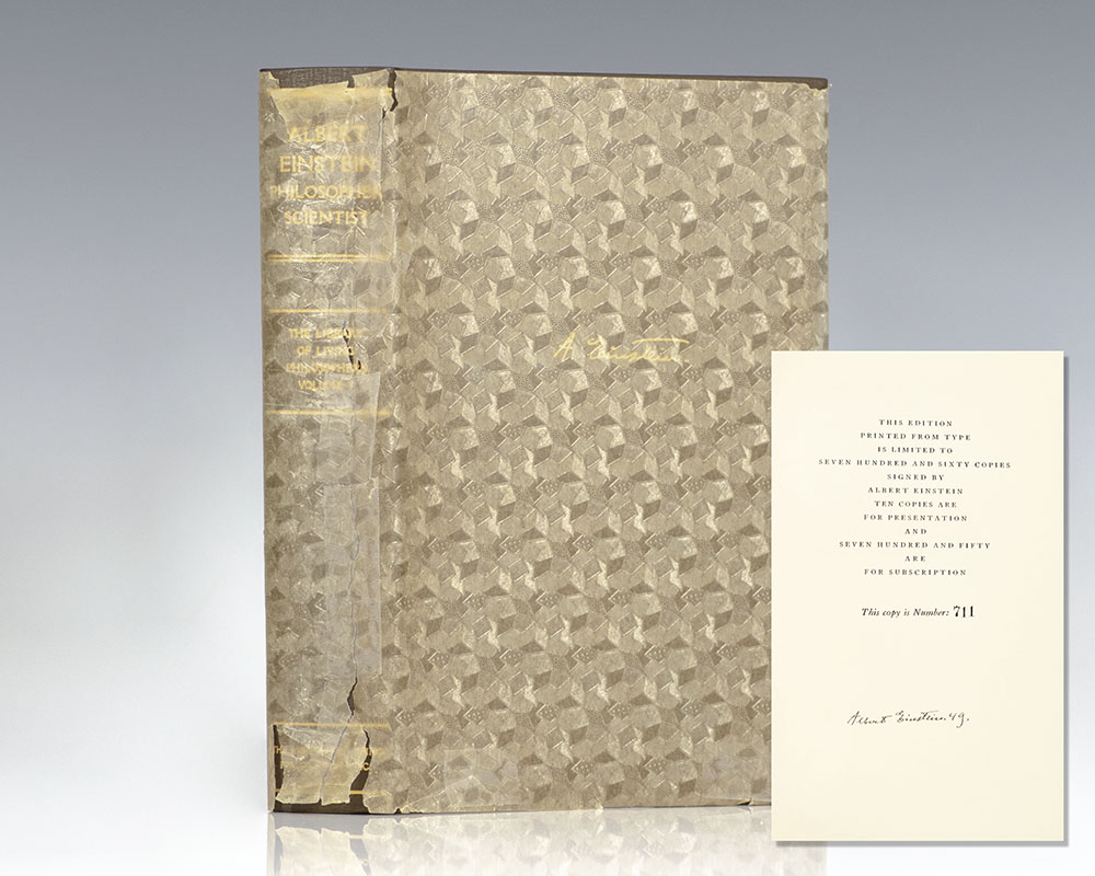 Signed limited first edition, number 711 of 760 copies signed and dated "Albert Einstein ‘49." Octavo, original brown cloth, top edge gilt. The book is in fine condition in the rare original dust jacket, which is in very good condition. Edited by Paul Arthur Schilpp. Frontispiece portrait of Einstein by Yousef Karsh. Rare and desirable in this condition.