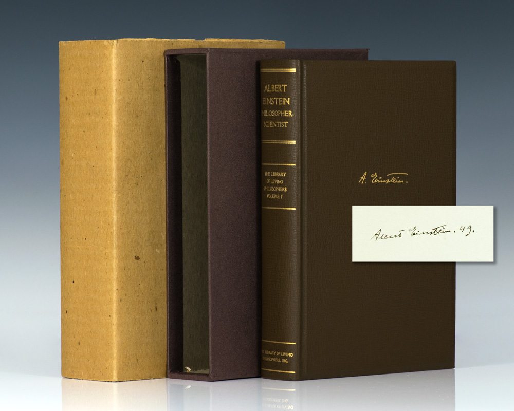 Signed limited first edition, one of 760 copies signed and dated "Albert Einstein ‘49", this is number 499. Octavo, original brown cloth, top edge gilt, original slipcase. The book is in fine condition, the slipcase is in fine condition. Housed in the original publisher's cardboard. An absolute pristine example, which has been stored in the original cardboard box since publication. Edited by Paul Arthur Schilpp. Frontispiece portrait of Einstein by Yousef Karsh. Rare and desirable in this condition.